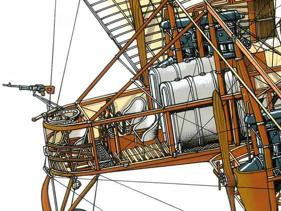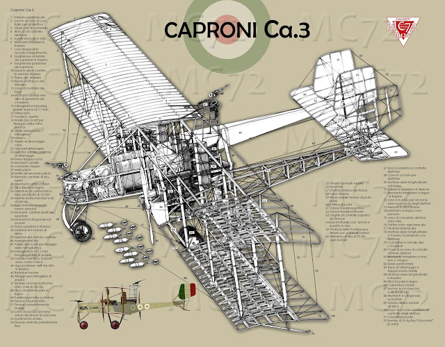 “””…Ed ecco il N. 3, frutto supremo delle ansie ultime, quando sorrise piena vittoria agli sforzi tenaci. Si addossa ai fratelli maggiori, più ampio, tutto giallo in perfetto ordine di marcia. L’ing. Caproni gentilmente ci spiega. La direzione è tutta concentrata nel volante che ingegnosamente provvede a tutte le manovre. Un bilanciere ai piedi le sussidia. Le ali, mi perdonino i tecnici se i termini sono poco appropriati, si curvano in una specie di doppia curvatura e presentano la particolarità di evitare, possibilmente, i risucchi d’aria. La coda è semirigida e tende a evitare possibili capovolgimenti. Il motore è anteriore, ed il posto per l’aviatore è tra la coda e le ali. Le precauzioni e le prudenze dopo queste ultime tragiche morti, risorgono e s’impongono e lottano coraggiose a scacciare nei limiti del possibile, i lutti che il triste destino prepara ad ali men salde e temerarie. Si tenta un volo malgrado la neve alta. L’amico devoto, Zweifel, sale sul seggiolino, e tenta a più riprese… Ma è inutile. La neve ostacola ogni mossa, ed il N. 3 ritorna fra gli altri fratelli a sonnecchiare finché, dileguato il bianco mantello, più tardi, il vortice turbinoso dell’elica piegherà a terra gli sterpi piccini della brughiera”””.