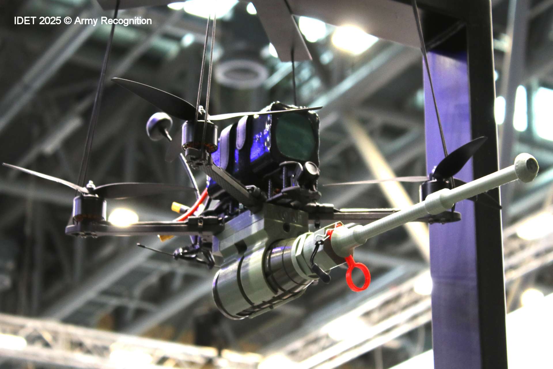Unveiled on the same day at IDET 2025, a novel quadcopter drone configured for direct-attack missions against armored targets was also presented in a suspended display. The compact UAV features a robust quad-rotor airframe designed to carry and stabilize a lightweight anti-tank munition mounted along its longitudinal axis. The munition, appearing to be a modified rocket-propelled grenade or similar shaped-charge warhead, is fixed beneath the drone’s central body, with its safety pin still in place for static exhibition. The UAV is further equipped with a forward-facing optical payload, likely comprising day and infrared sensors for target identification and precision engagement. Electrical cabling and structural reinforcements suggest the drone is engineered to deliver the munition in a controlled, deliberate attack run.