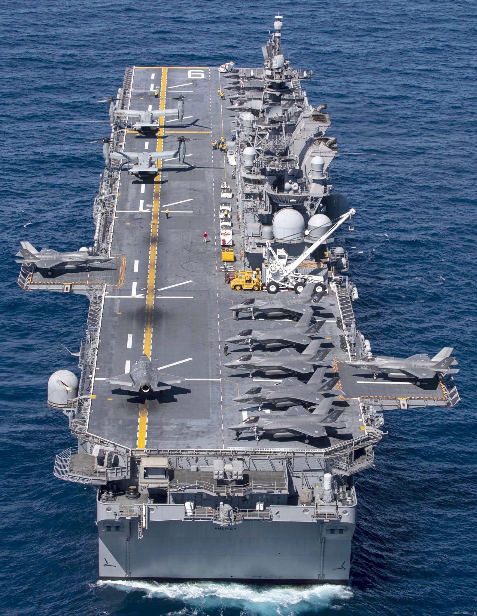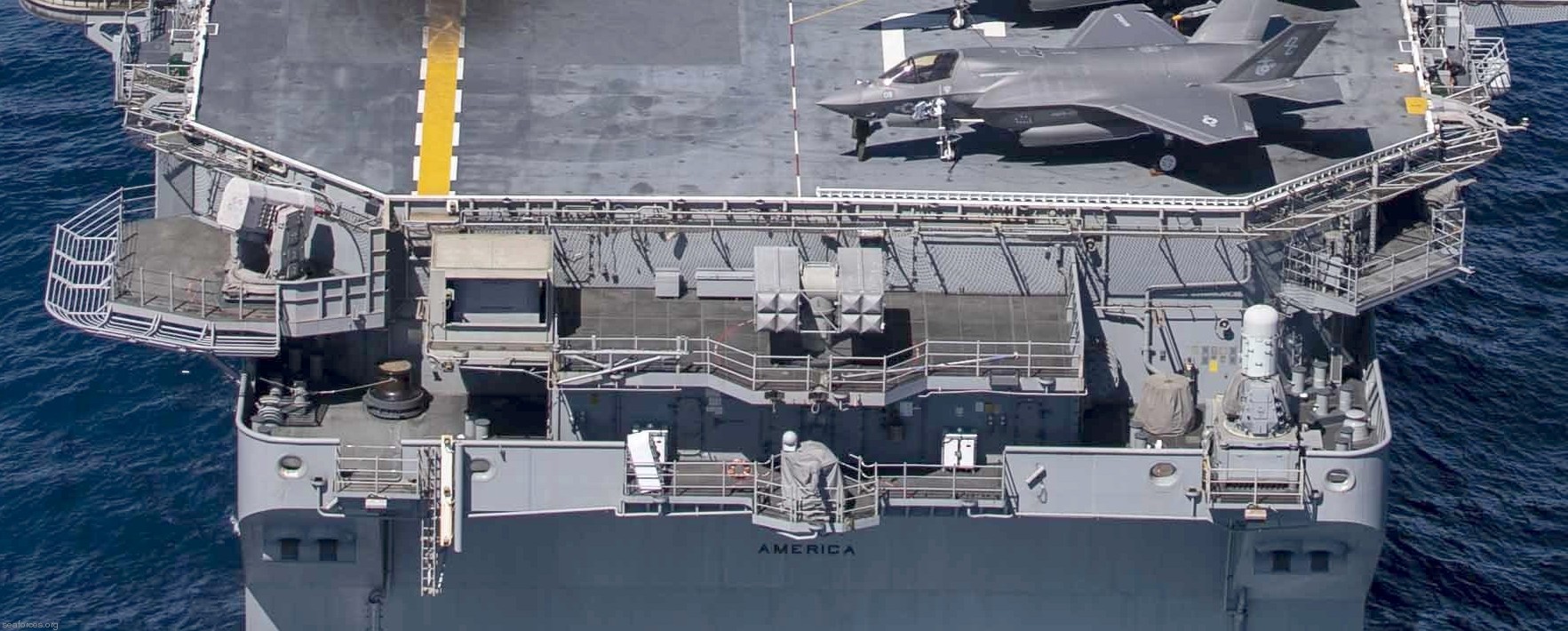 La USS America può essere utilizzata come una piccola portaerei con uno squadrone di caccia a reazione più diversi elicotteri multiuso, come l’ MH-60 Seahawk. Può trasportare da 20 a 25 F-35B; le future navi di questa classe, a partire dalla USS Bougainville (LHA-8), avranno un hangar più piccolio per lasciare più spazio a mezzi anfibi.