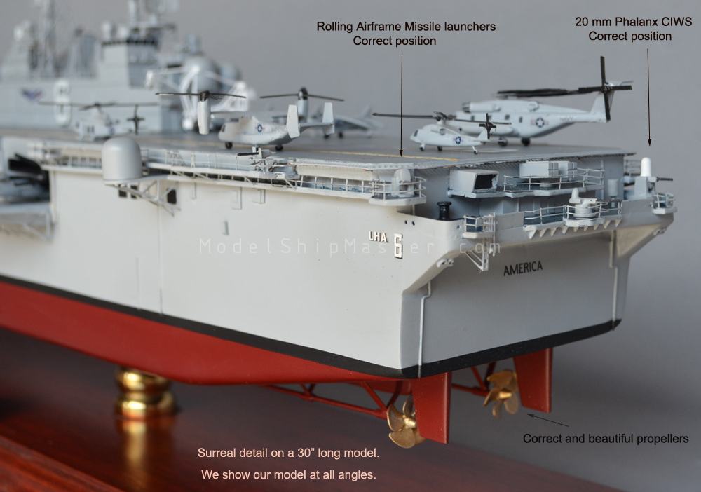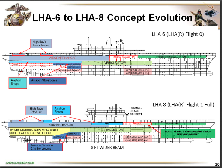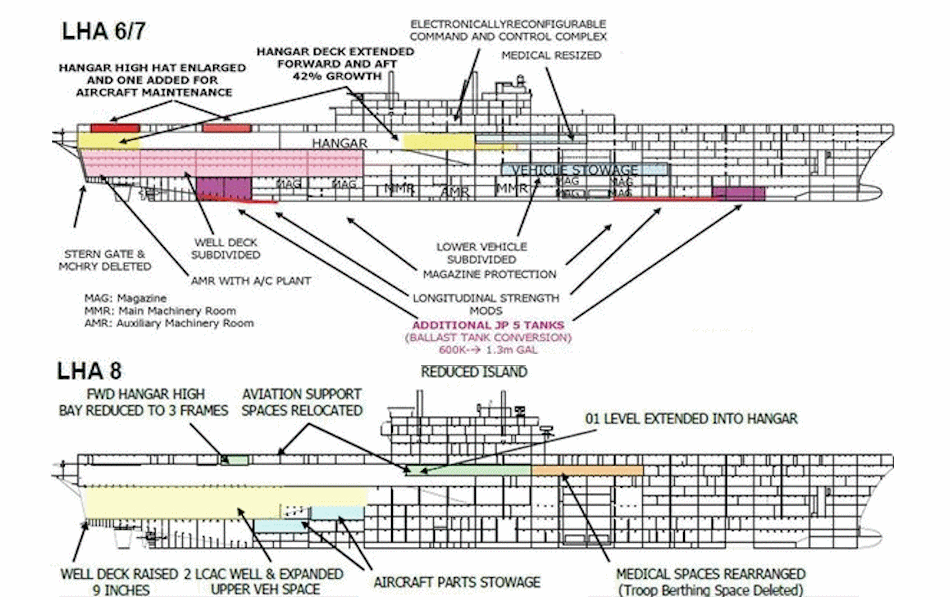 Il Corpo dei Marines degli Stati Uniti è abbastanza preoccupato per gli attacchi missilistici anti-nave da parte di imbarcazioni da attacco rapido e per i lanci missilistici di precisione a lungo raggio provenienti da terra. Per contrastare tali attacchi, il Corpo dei Marines vuole mantenere le navi anfibie più lontano dalla costa. Per questo i Marines saranno trasportati a terra con gli aeromobili MV-22 V / STOL di maggior raggio d’azione e autonomia. Per soddisfare queste esigenze, l’America ha il doppio del dislocamento delle navi d’assalto anfibie di classe Iwo Jima in pensione.