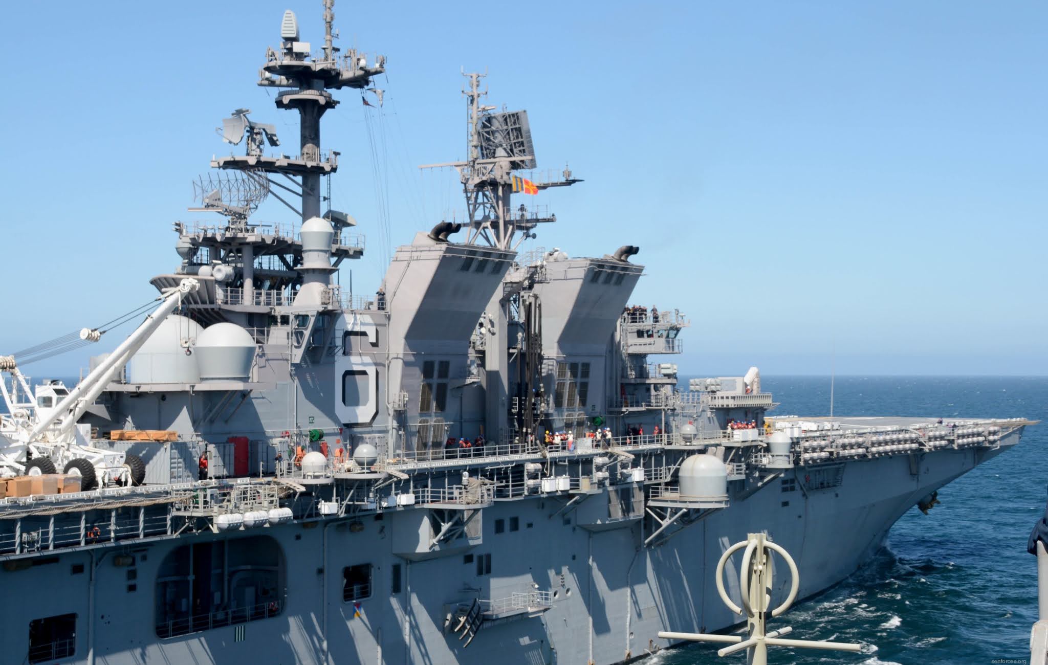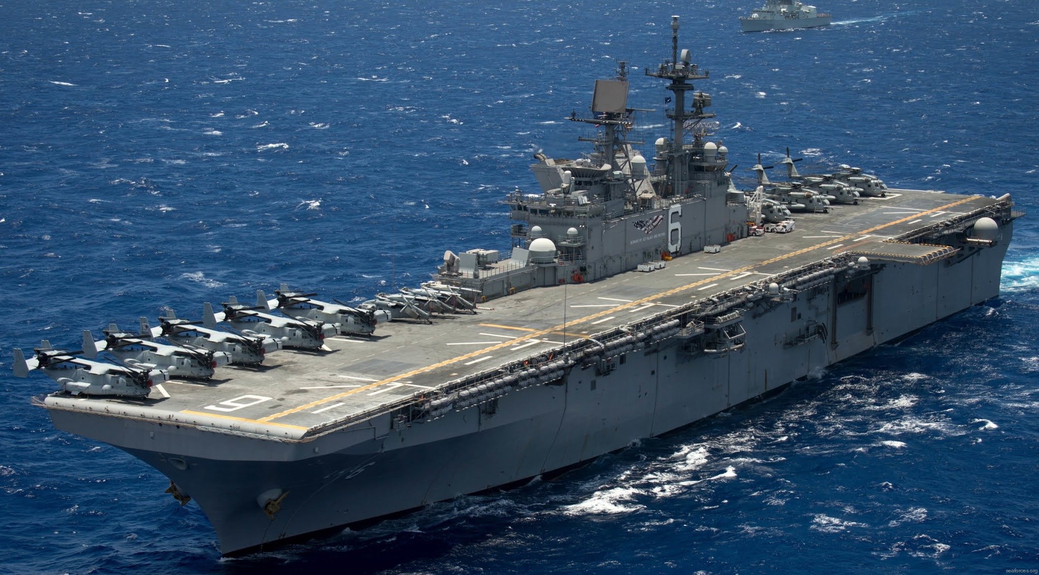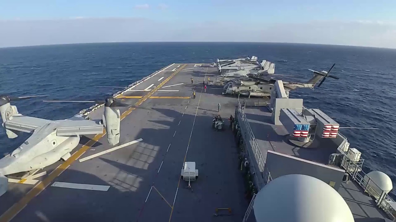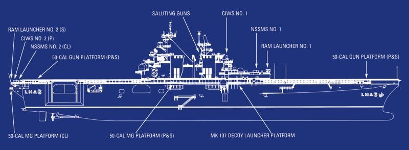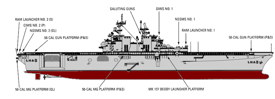 Può trasportare circa 20 AV-8B o F-35B e due MH-60S, per fungere da piccola portaerei, come dimostrato dalle operazioni di atterraggio per elicotteri (LHD) nell’Operazione Iraqi Freedom.