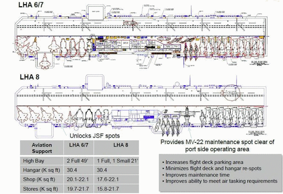 L’aggiunta di una baia allegabile lascerà meno spazio per gli aeromobili a bordo delle navi, ma l'”Early Operational Assessment” del 2005 ha criticato il progetto “Volo 0”. Inoltre, la USS America ha ridotto lo spazio di stivaggio per i veicoli militari e le dimensioni del suo ospedale sono state ridotte di due terzi rispetto alle Wasp.