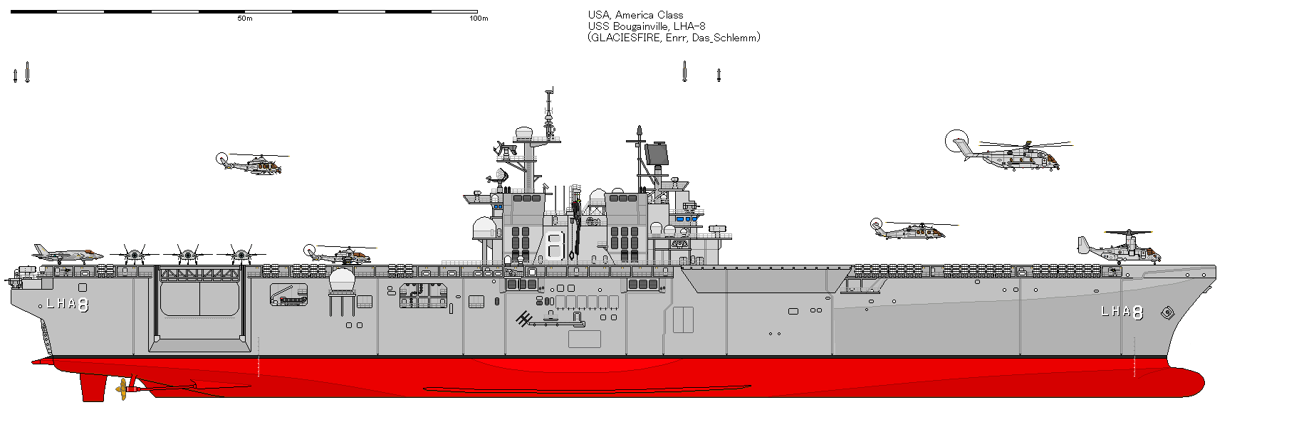 La terza nave della classe (USS Bougainville (LHA-8) sarà la prima della sua classe con una baia allegabile per il dispiegamento di veicoli anfibi. Mentre alla fine degli anni ’90 si poneva l’accento sui veicoli terrestri più leggeri, durante le operazioni in Iraq e in Afghanistan sono stati utilizzati veicoli corazzati più pesanti. Le future operazioni di contro-insurrezione richiedono navi in grado di trasportare e mettere a terra quei veicoli, anche attraverso l’uso di connettori; i requisiti di sollevamento del carico sono soddisfatti in modo più costoso dalle attrezzature per il trasporto aereo degli aerei. L’aggiunta del ponte del pozzo richiederà che l’isola della nave sia leggermente più piccola rispetto ai suoi due predecessori. I primi lavori di progettazione con fondi inizieranno nel 2015, i lavori di progettazione dettagliata e la costruzione inizieranno nel 2017 e l’LHA-8 entrerà in servizio nel 2024.