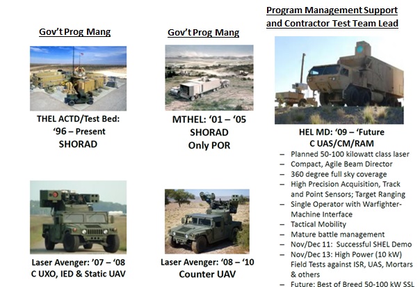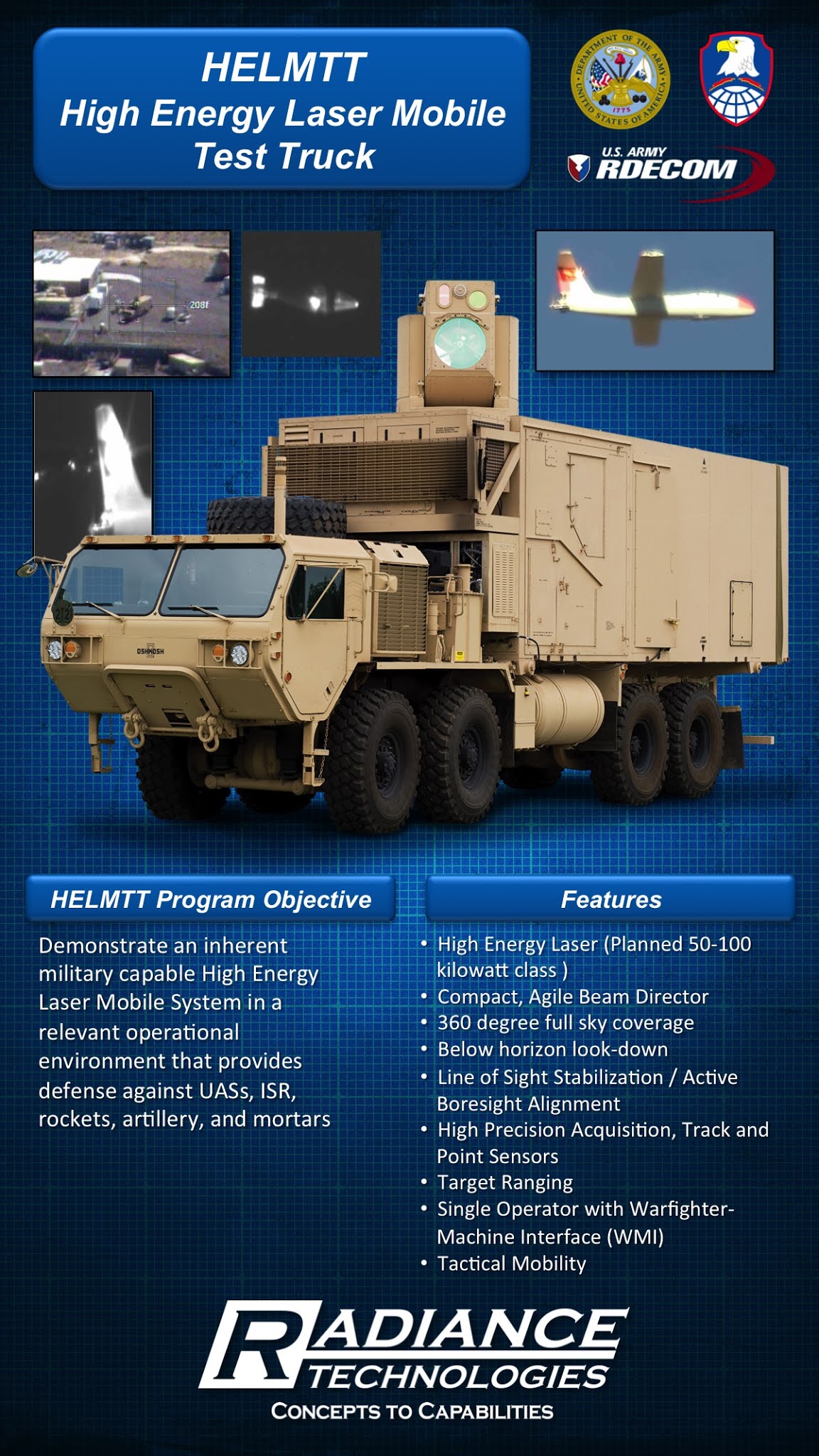 - High Energy Laser-Mobile Demonstrator (HEL-MD) è un sistema laser progettato dalla Boeing montato su un Heavy Expanded Mobility Tactical Truck (HEMTT). Il suo livello di potenza attuale è di 10 kW, che sarà aumentato a 50 kW e dovrebbe essere aggiornato a 100 kW. Gli obiettivi che possono essere ingaggiati sono colpi di mortaio, proiettili di artiglieria e razzi, veicoli aerei senza pilota e missili da crociera. Stato sconosciuto.