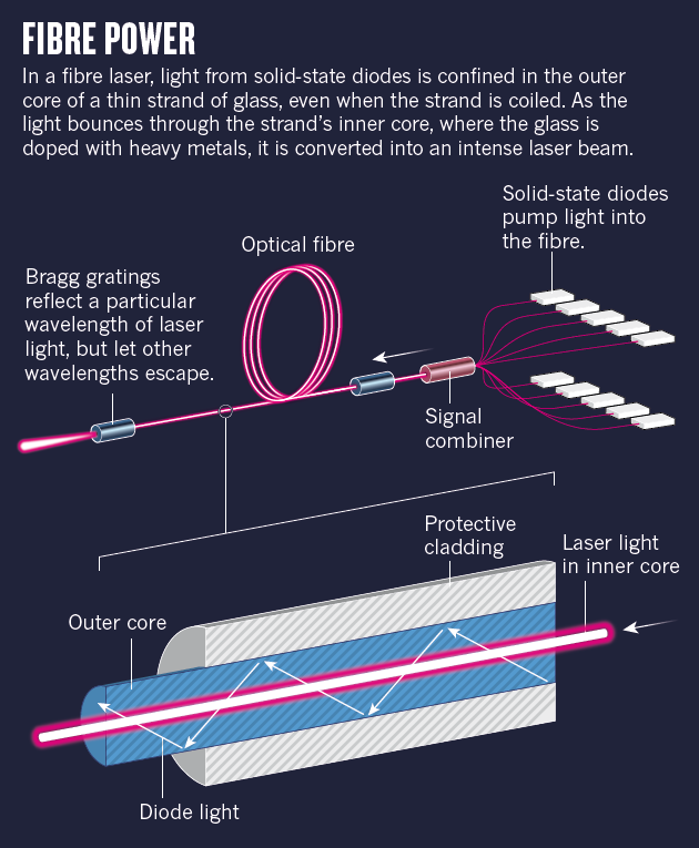 - Diffondere il raggio su un grande specchio curvo che concentra la potenza sul bersaglio, per mantenere la densità di energia lungo il percorso troppo bassa perché avvenga la fioritura. Ciò richiede uno specchio grande, molto preciso e fragile, montato un po’ come un proiettore, che richiede un macchinario ingombrante per ruotare lo specchio per puntare il laser.