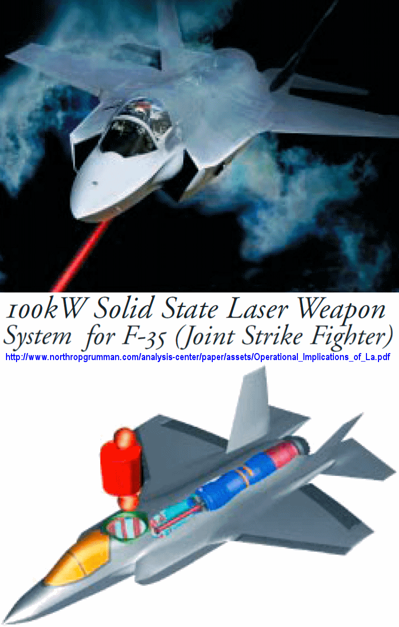 - Realizzato da Northrop Grumman: Il 18 marzo 2009, Northrop Grumman ha annunciato che i suoi ingegneri a Redondo Beach avevano costruito e testato con successo un laser elettrico in grado di produrre un raggio di luce da 100 kilowatt, abbastanza potente da distruggere missili da crociera, artiglieria, razzi e colpi di mortaio. Un laser elettrico è teoricamente in grado, secondo Brian Strickland, manager del programma Joint High Power Solid State Laser dell’Esercito degli Stati Uniti, di essere montato su un aereo, una nave o un veicolo perché richiede molto meno spazio per il suo apparecchiature di supporto rispetto a un laser chimico. Sperimentale.