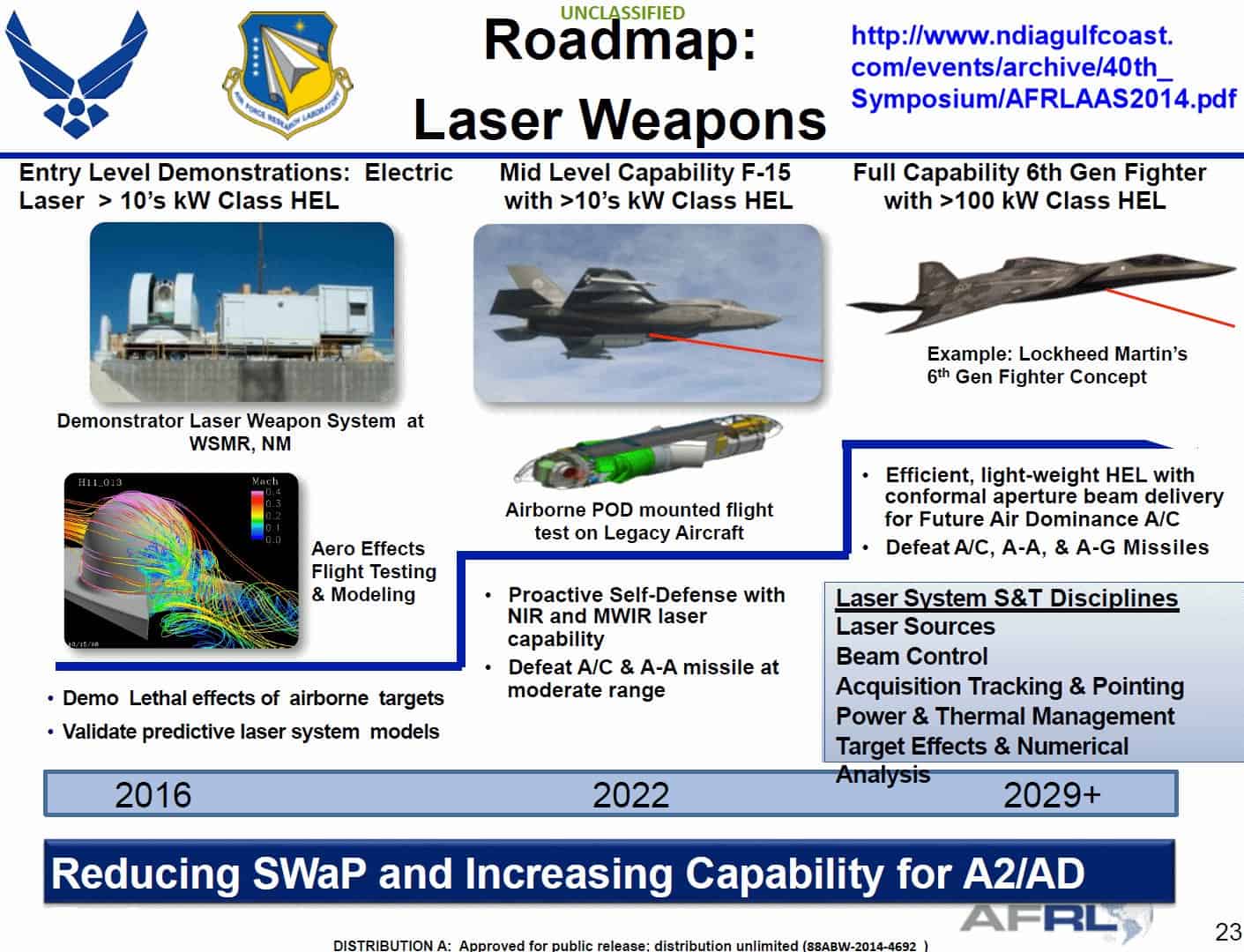 - Per tutti gli anni 2000, l’USAF ha lavorato sul Boeing YAL-1, o ATL, un laser a gas CO2 aerotrasportato o laser chimico COIL montato su un Boeing 747 modificato. Doveva essere utilizzato per abbattere missili balistici in arrivo. Nel marzo 2009, Northrop Grumman ha affermato che i suoi ingegneri a Redondo Beach avevano costruito e testato con successo un laser allo stato solido alimentato elettricamente in grado di produrre un raggio di 100 kilowatt, abbastanza potente da distruggere un aereo. Secondo Brian Strickland, manager dell’US ARMY il Joint High Power Solid State Laser, era un laser alimentato elettricamente che poteva essere installato su di un aereo, una nave o un altro veicolo perché richiedeva molto meno spazio per la sua attrezzatura di supporto rispetto a un laser chimico. Tuttavia, la fonte di una tale potenza elettrica in un’applicazione mobile è rimasta poco chiara. Alla fine, il progetto è stato ritenuto non fattibile, ed è stato annullato nel dicembre 2011, con il prototipo Boeing YAL-1 immagazzinato e infine smantellato.