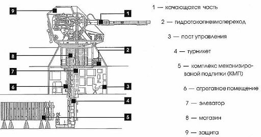 - Utilizza un sistema indipendente di caricamento delle munizioni su due lati (dai caricatori di sinistra e di destra) che fornisce la disponibilità simultanea per il fuoco di due diversi tipi di munizioni e aumenta di quasi 1,5 volte la velocità di fuoco (rispetto a quella di supporti di artiglieria simili) così come nella sopravvivenza.