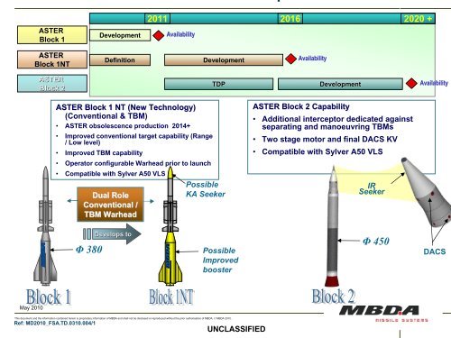 - Con piattaforme navali europee equipaggiate con ASTER Bl2 inter-operabile con piattaforme navali americane Aegis SM-3, che garantisce una più ampia copertura di protezione geografica, ma anche una migliore tenuta contro la minaccia, in caso di saturazione di attacchi diversi tipi di missili, ad esempio; l’ASTER Block 2 offre una capacità navale ottimale oltre al sistema SM-3 / Aegis;