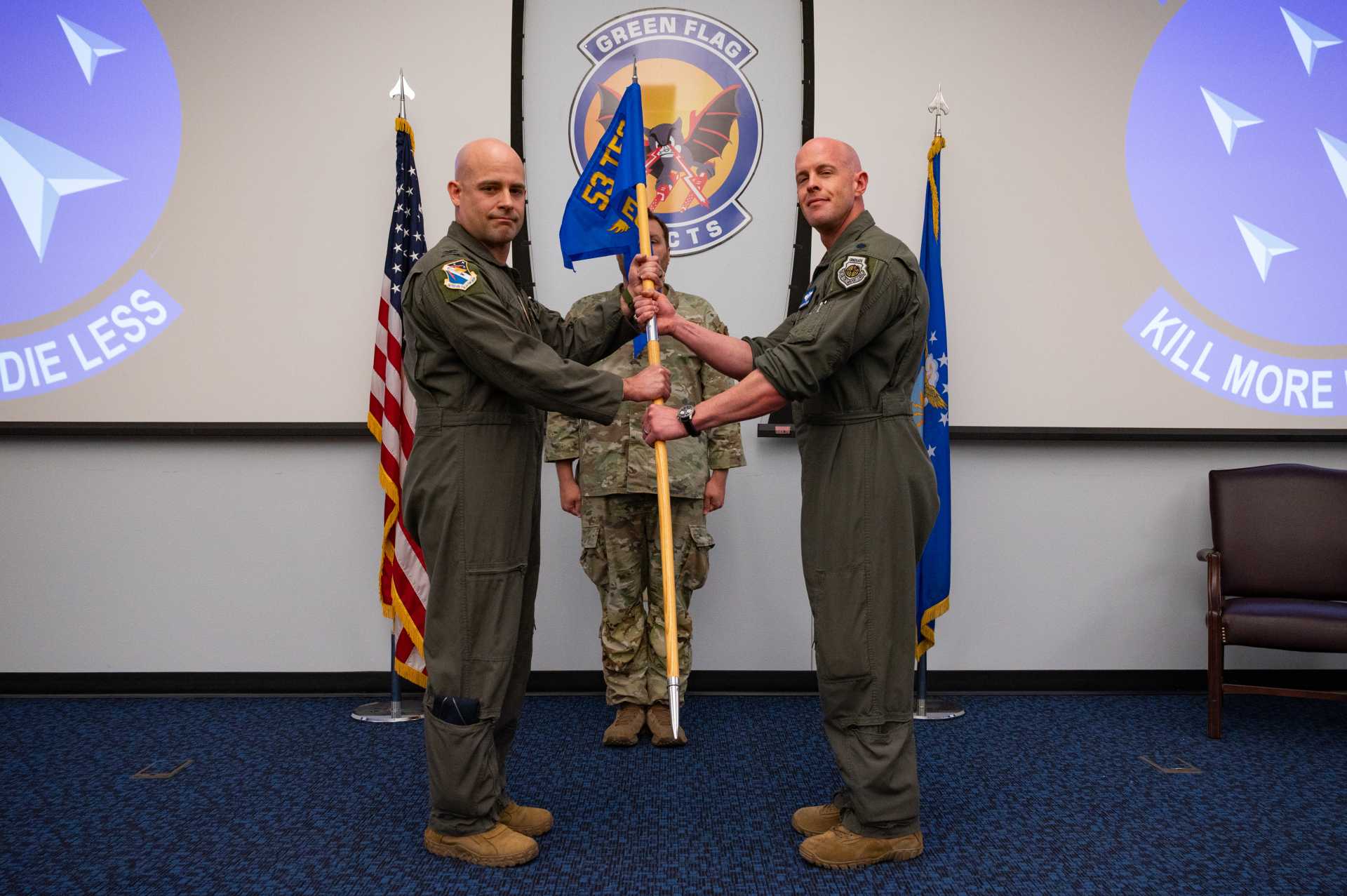 U.S. Air Force Col. Joshua M. Biedermann, left, 53rd Test and Evaluation Group commander, passes the unit guidon to Lt. Col. Matthew W. Jensen, inaugural commander of the Experimental Operations Unit (EOU), during the EOU activation ceremony at Nellis Air Force Base, Nevada, June 5, 2025. (Picture source: U.S. Air Force)