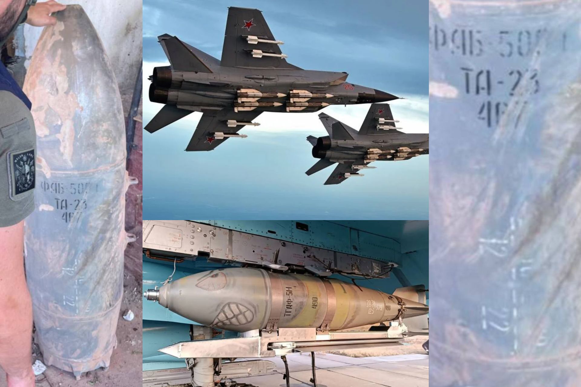 on sides: unexplosed FAB 500 visuals, top : Mig 25 RB equipped with full payload 4 air to air missile , 4 air to ground guided missile, bottom : FAB-500M62 mounted under Mig wing. ( Picture sources : OSINT, Ukrainian fighters )