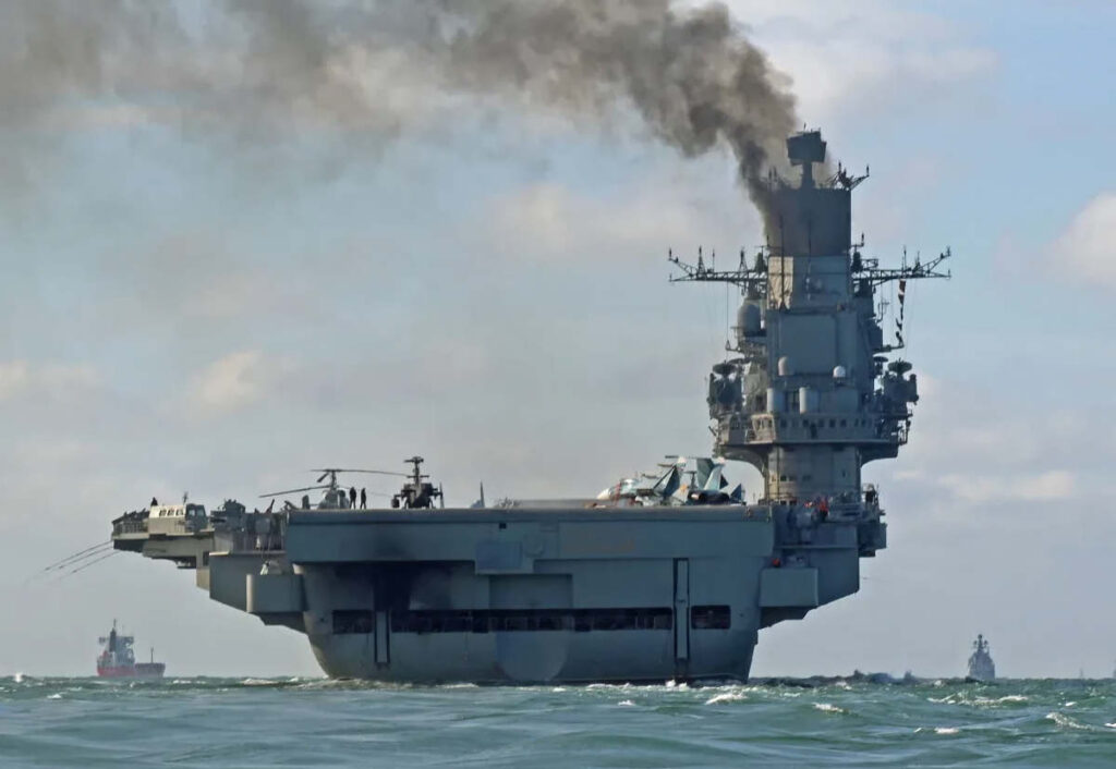 E proprio sulla Marina si rivolge l’attenzione, specie dopo le perdite subite nel Mar Nero, una Forza Armata che persegue, come può, programmi di modernizzazione e allestimento navali concentrati – come sempre – su sommergibili lanciamissili e d’attacco1, e navi di superficie di minore dislocamento ma particolarmente equipaggiate2. Interessanti e da analizzare i progetti di modernizzazione di navi già esistenti, che potrebbero chiarire meglio il quadro, visto che interessano navi di stazza e rilevanza maggiori come gli incrociatori nucleari da battaglia Pyotr Velikiy e Admiral Nakhimov da 28.000 tonnellate, ambedue appartenenti alla vetusta classe Kirov, senza contare l’Admiral Kutnetsov (foto seguente), portaerei – l’unica – famosa per le sue densissime fumate nere e per gli incidenti di volo.