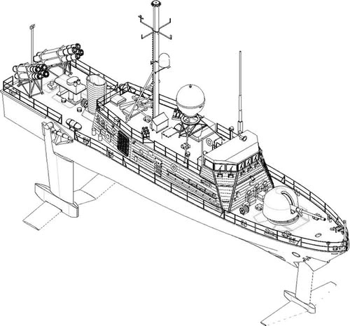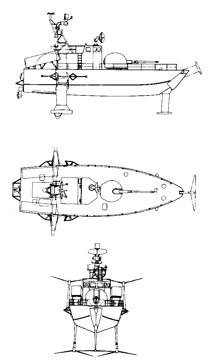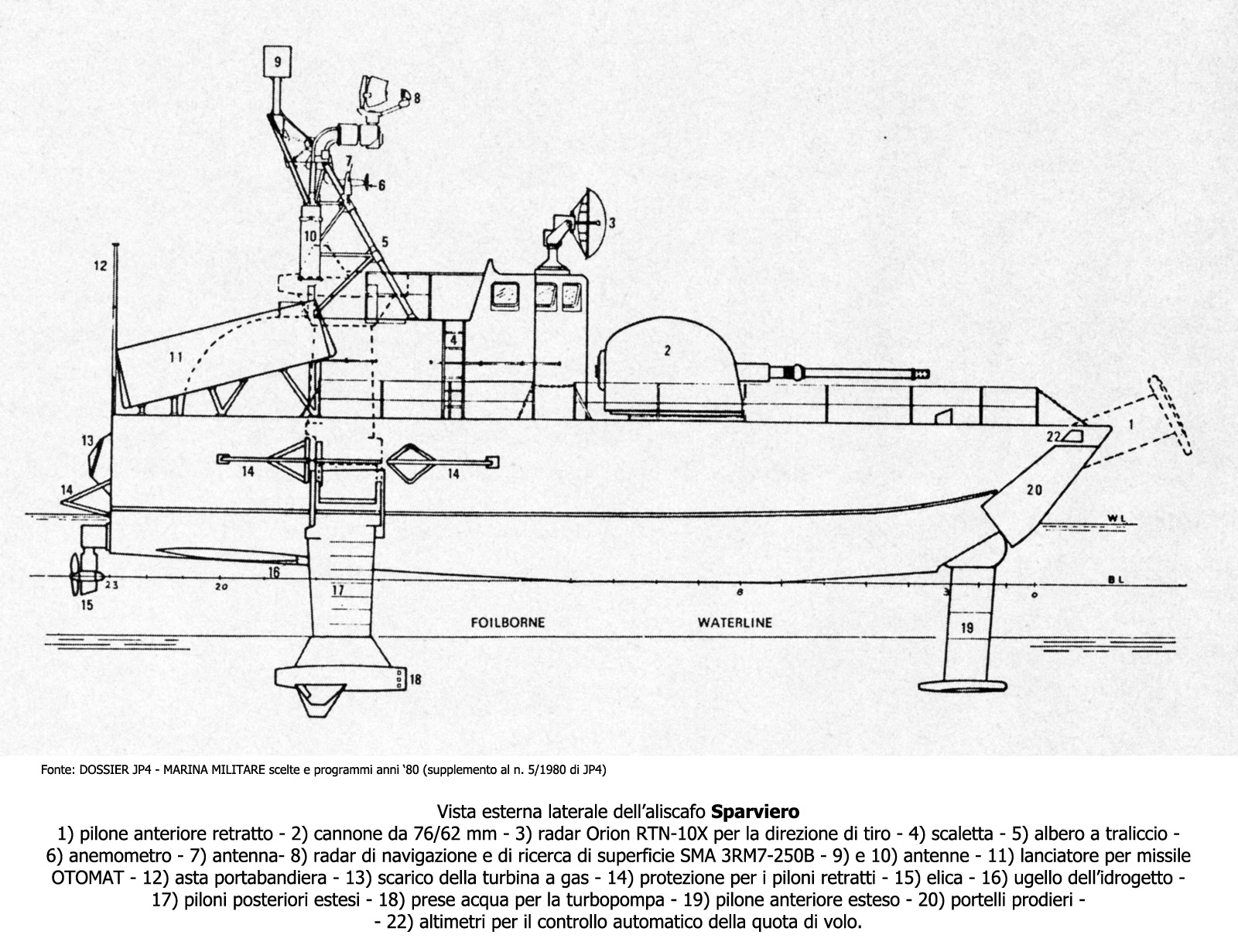 Dotati di un sistema alare completamente immerso, realizzato in acciai speciali e ripiegabile, questi aliscafi non sono dotati di stabilità intrinseca in sostentamento alare. La stabilità è ottenuta con un sistema di sensori giroscopici ed accelerometrici, controllati da un computer e attuati attraverso superfici di controllo sul sistema alare, utilizzate anche per manovrare le unità in sostentamento. Propulsi a idrogetto mediante una pompa calettata su una turbina a gas Rolls-Royce da 4500 hp, con aspirazione attraverso il sistema alare e spinta attraverso 2 ugelli posti a 2/3 dello scafo (velocità continuativa oltre 45 nodi), gli aliscafi erano dotati anche di un motore diesel con piede poppiero per la propulsione in galleggiamento (v max 6 nodi) e di 2 APU di tipo aeronautico per la generazione idraulica ed elettrica (440 V 400 Hz). Lo scafo, in leghe leggere, è suddiviso in cinque compartimenti stagni. La sovrastruttura comprende COC e plancia (oltre al sistema di aspirazione TAG) ed è sovrastata dalla colonnina radar/optoelettronica della direzione del tiro, mentre un alberetto a traliccio porta il radar di scoperta, il sistema di guida dei missili OTOMAT, i sistemi ESM ed ECM e le antenne per le comunicazioni. L’equipaggio era composto da 2 ufficiali inferiori e 8 sottufficiali, l’abitabilità ridotta ai minimi termini.