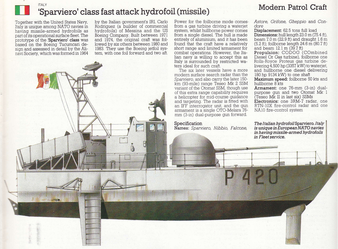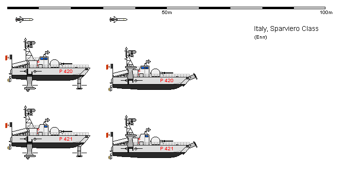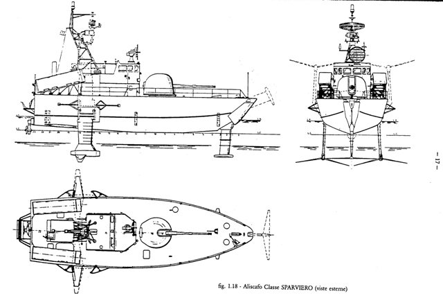Sorprendentemente piccoli, essi disponevano di un cannone OTO Compatto da 76/62 da 90 colpi al minuto e 2 missili a lungo raggio Otomat, ma il raggio d’azione era di soli 500 km e i costi operativi comparabili con quelli di una fregata. Proprio a causa degli elevati costi d’esercizio, e dei nuovi scenari creatisi con la fine della guerra fredda, le unità di questa classe sono state prima messe in riserva, e poi nel 2000 ne è stata anche tentata la vendita all’estero, con scarso successo. Anche la stessa marina giapponese, che tra il 1991 ed il 1993 mise in servizio le tre unità PG-01, derivate dal tipo Sparviero, dopo aver previsto inizialmente altre 9 unità ha optato successivamente per unità d’attacco veloci di tipo convenzionale.