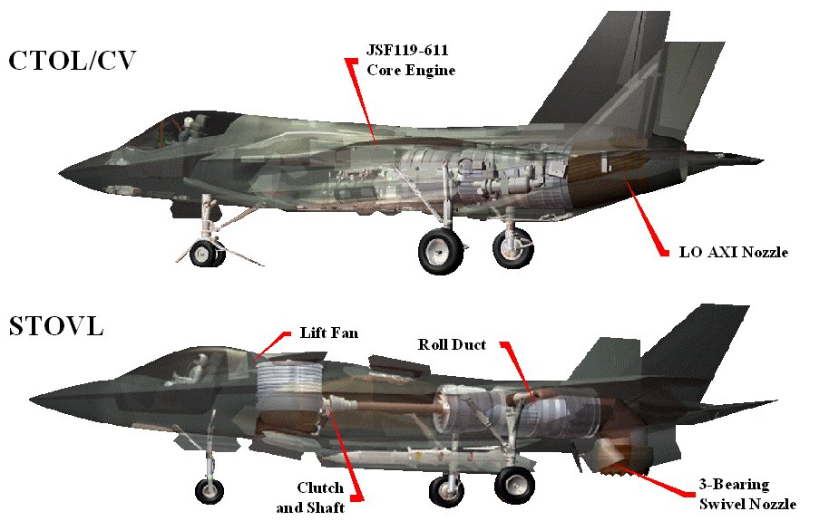 Il sistema di decollo verticale, della versione STOVL (Short Take Off Vertical Landing) è composto dal motore, una turboventola a basso rapporto di diluizione con postbruciatore come su un normale aereo da combattimento, fornito di un ugello di coda dotato di un particolare meccanismo di rotazione che permette di orientare il flusso dei gas di scarico verso il basso, e da una ventola anteriore verticale a due stadi controrotanti, posta subito dietro l’abitacolo; quando questa vene innestata all’albero della turbina di bassa pressione del motore, attraverso un albero e un giunto di collegamento, trasforma il propulsore in una sorta di turbo-fan ad alto rapporto di diluizione a flussi separati ottenendo, grazie al miglior rendimento di questo tipo di propulsore, un surplus di spinta che viene utilizzato per il sostentamento verticale della parte anteriore e centrale del velivolo. Il controllo del rollio viene effettuato deviando aria pressurizzata, spillata dal compressore a bassa pressione, verso ugelli posti sotto le ali. Il motore produce una spinta di 128,1 kN a secco e 191,3 kN (213,5 kN al decollo) con post-combustione inserita; quando la ventola anteriore è innestata, la spinta a secco diventa di 80 kN dall’ugello di coda, 89 kN dalla ventola anteriore verticale e 8,7 kN da ciascuno dei due ugelli per il controllo laterale, per un totale di 186,4 kN.