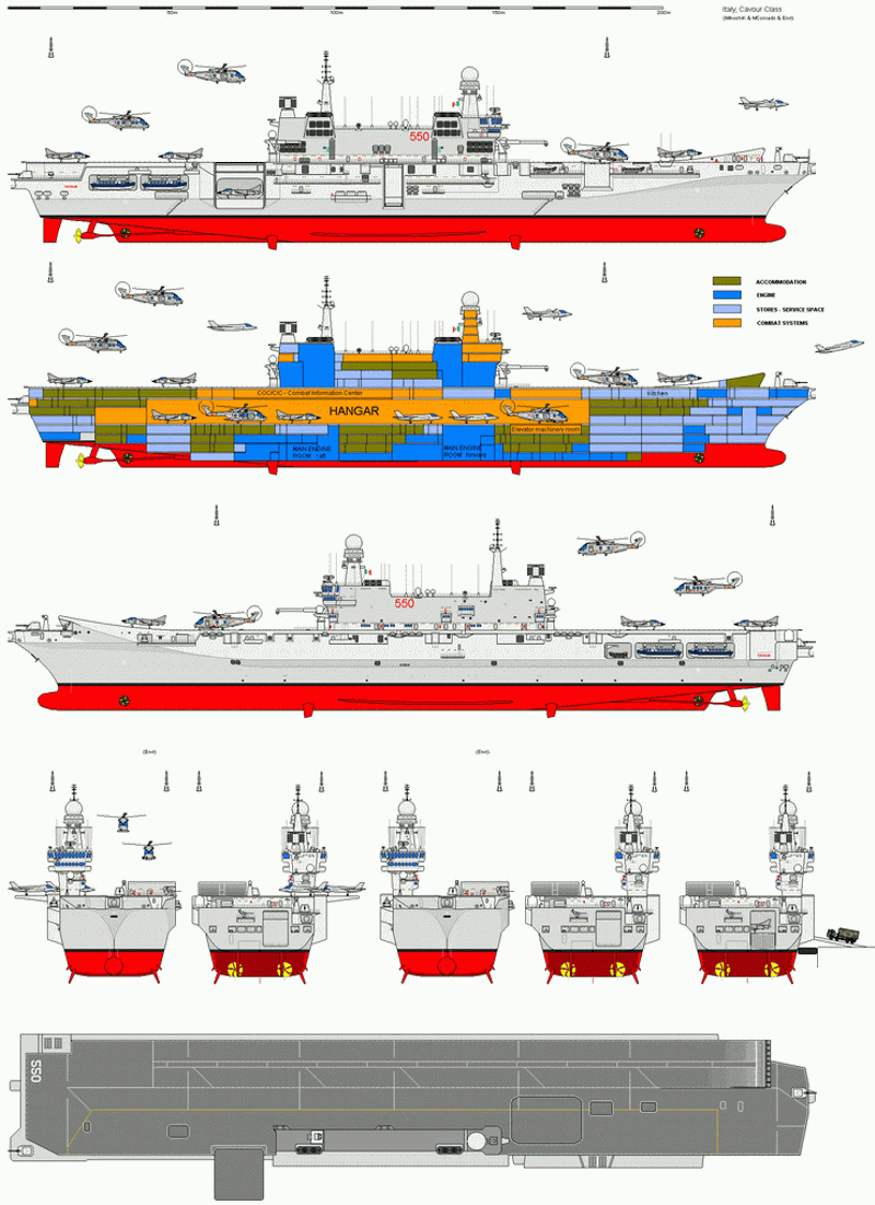 Il Cavour avrà spazio sufficiente per dieci F-35B STOVL (Short Take Off Vertical Landing) nell’hangar e altri sei parcheggiati sul ponte.