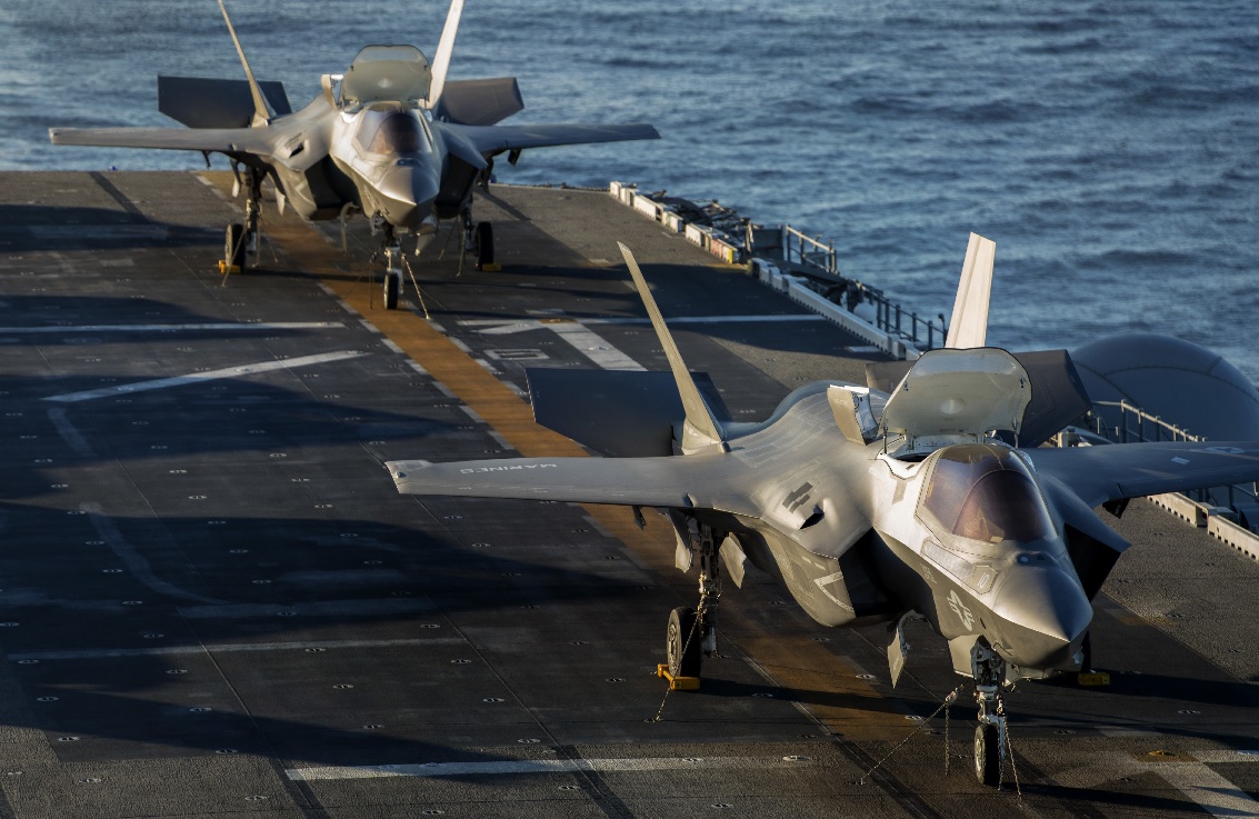Due caccia stealth F-35B Stovl “Lighting II” sono appontati sulla portaerei della Marina Militare Italiana ITS Cavour (CVH 550) il 1° marzo 2021.