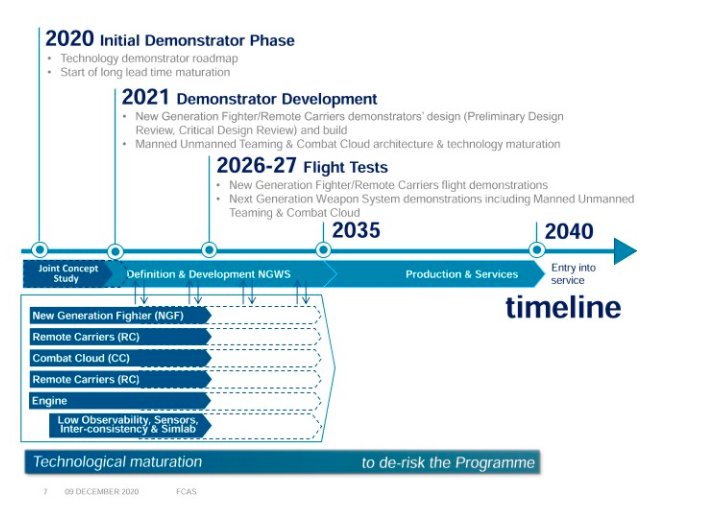 Nel 2017 Germania e Spagna hanno chiesto ad Airbus di iniziare a lavorare su una proposta per un nuovo caccia con il nome Future Combat Air System (FCAS). All’ILA Berlin Air Show 2018, Dassault Aviation e Airbus hanno annunciato un accordo per cooperare allo sviluppo dell’FCAS. Nel dicembre 2018, il ministero della Difesa tedesco ha accolto con favore la manifestazione di interesse della Spagna per il programma. Nel giugno 2019 la Spagna ha aderito al programma. A dicembre 2019 Safran e MTU Aero Engines hanno concordato la fondazione di una joint venture 50/50 che sarà incorporata entro la fine del 2021 per gestire le attività di sviluppo, produzione e supporto post-vendita del nuovo motore che spingerà l’NGF. Il 12 febbraio 2020, la prima fase (1A) del programma di ricerca e sviluppo è stata approvata dalla commissione per il bilancio del parlamento tedesco. Ha istituito la distribuzione industriale dei primi cinque sottoprogrammi.