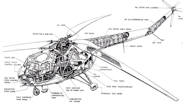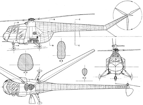 Le pale del rotore principale a tre pale erano fissate alla testa del rotore con piastre in acciaio intercalate leggere mentre i tiranti trasportavano i carichi di tensione centrifuga. Le leve delle pale erano collegate tramite giunti sferici ai bracci di un ragno di controllo, il cui cono veniva azionato su e giù dalla leva del passo collettivo che cambiava il passo di tutte le pale; venne utilizzato un meccanismo irreversibile per impedire che i carichi della lama venissero ritrasferiti al joystick. Le pale erano supportate da ferme o girando lentamente da fermi statici, e mantenevano una distanza minima tra le punte delle pale e il tailboom anche in caso di vento forte; questi arresti venivano ritirati sopra i 100 giri / min in modo che fosse possibile la piena libertà di movimento per un volo efficace.