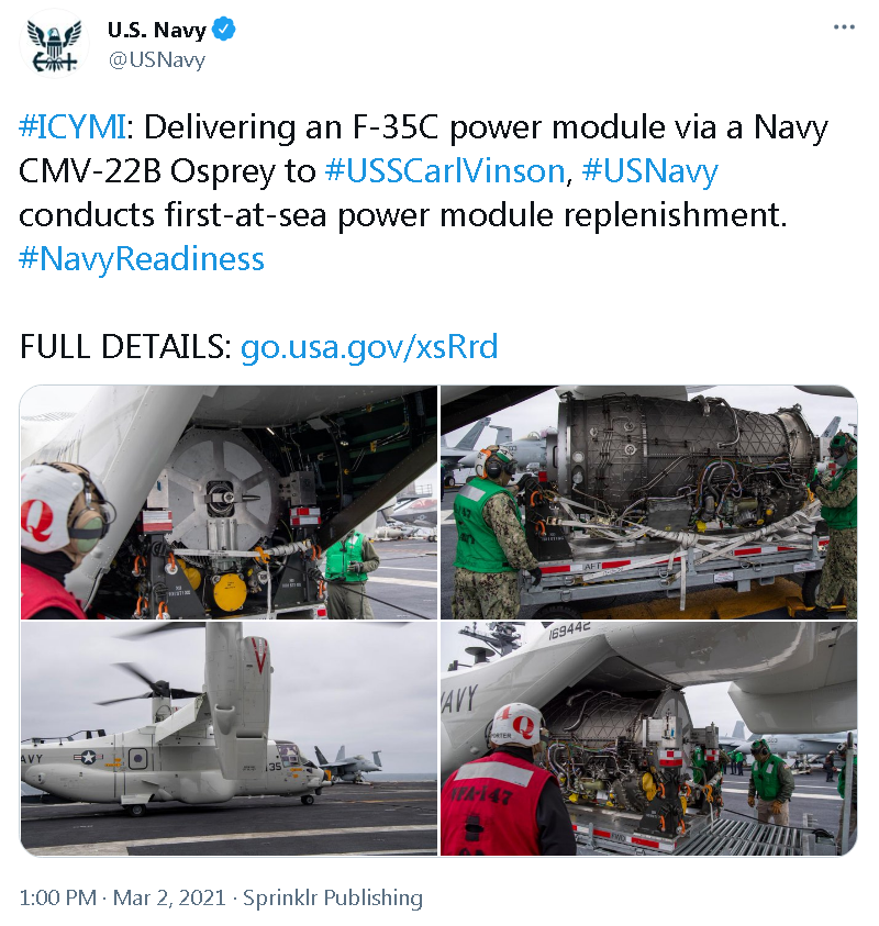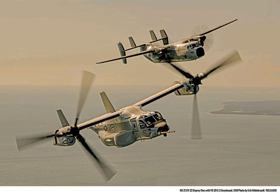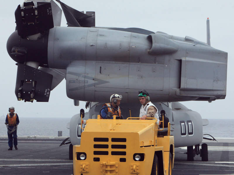 Il CMV-22B Osprey è una variante dell’MV-22B e sarà il sostituto del C-2A Greyhound per la missione Carrier Onboard Delivery (COD). L’Osprey è un velivolo Tiltrotor V / STOL che può decollare e atterrare come un elicottero ma transitare come un aereo turboelica.