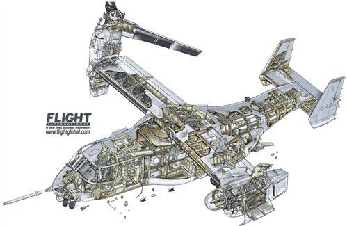 - CV-22B: versione per operazioni speciali, adatta all’infiltrazione e all’esfiltrazione a lungo raggio di uomini e materiali in ambiente notturno, prodotta in 51 esemplari per l’United States Special Operations Command (USSOCOM) dell’U.S. Air Force, ed introdotta in servizio nel marzo 2006 presso la Kirtland AFB. La capacità carburante è pari a 2 230 litri, e nel vano di carico possono trovare posto tre serbatoi supplementari da 200 o 430 galloni. La dotazione elettronica comprende un radar multi mode Raytheon AN/APQ-186, sensore elettro-ottico (FLIR) Raytheon AN/ALQ-27, sistema di autodifesa SIRFC (Suite of Integrated Radio Frequency Countermeasures) AN/ALQ-211(V)2 con lanciatore di chaff/flares AN/ALE-47 e sistema DIRMC (Directional Infrared Counter Measures) AN/AQQ-24 Nemesis. L’equipaggio è composto da due piloti e due ingegneri di volo e dispone di un avanzato glass cockpit con quattro schermi MFD, una Central Display Unit, un Head-up display utilizzabile con occhiali da visione notturna (NVG), e Helmet Mounted Display. Il vano di carico consente di trasportare 4 540 kg di materiali, o 24 soldati seduti o 32 seduti sul pavimento. L’armamento difensivo è composto da una mitragliatrice Browning M2 da 12,7 mm o M240 da 7,62 mm, mentre per la difesa passiva vi sono pannelli di blindatura sul pavimento. Il programma V-22 originariamente comprendeva Navy 48 HV-22, ma nessuno è stato ordinato. Nel 2009 è stato proposto di sostituire il C-2 Greyhound per la consegna a bordo del vettore (COD). Un vantaggio del V-22 è la capacità di trasportare rifornimenti e persone tra navi non portaerei oltre la portata dell’elicottero. I sostenitori hanno affermato che è in grado di raggiungere velocità, capacità di carico e prestazioni di sollevamento simili a quelle del C-2 e può trasportare carichi utili maggiori su brevi distanze, fino a 20.000 libbre, compresi i carichi esterni sospesi. Il C-2 può consegnare solo merci ai vettori, richiedendo un’ulteriore distribuzione a navi più piccole tramite elicotteri, mentre il V-22 è certificato per operare su navi anfibie, portaerei e navi logistiche. Potrebbe anche assumere alcuni ruoli di elicottero montando un paranco da 600 libbre sulla rampa e una configurazione di cabina per 12 pazienti non deambulanti e 5 posti per assistenti medici. Bell e P&W progettarono un telaio per il V-22 per trasportare il motore Pratt & Whitney F135 del Lockheed Martin F-35. Il 5 gennaio 2015, la US NAVY e l’USMC hanno firmato un memorandum d’intesa per l’acquisto del V-22 per la missione COD. Inizialmente designato HV-22, quattro aeromobili sono stati acquistati ogni anno dal 2018 al 2020. Incorpora un sistema di alimentazione a raggio esteso per una portata non rifornita di 1.150 nmi (1.320 mi; 2.130 km), una radio ad alta frequenza per comunicazioni oltre l’orizzonte e un sistema di diffusione sonora per comunicare con i passeggeri; l’aumento della autonomia è dovuta da serbatoi di carburante extra, con l’utilizzo di serbatoi esterni più grandi: l’unica differenza esterna rispetto ad altre varianti. La sua missione principale è la logistica a lungo raggio, altre possibili missioni includono il recupero del personale e le operazioni speciali. Nel febbraio 2016, la Marina statunitense lo ha ufficialmente designato come CMV-22B. Il programma della Marina originariamente prevedeva 48 velivoli, successivamente stabilì che ne erano necessari solo 44. La produzione è iniziata nell’esercizio 2018 e le consegne sono iniziate nel 2020. La Us Navy ha ordinato i primi 39 CMV-22B nel giugno 2018; si prevede che la capacità operativa iniziale sarà raggiunta nel 2021, con l’arrivo alla flotta entro la metà del 2020. Il primo CMV-22B ha effettuato il suo volo iniziale nel dicembre 2019.
