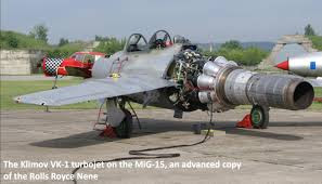 Immediatamente dopo la seconda guerra mondiale, l’Unione Sovietica ha prodotto copie dei motori tedeschi Junkers 004 e BMW 003 di prima generazione, che erano progetti avanzati con scarsa durata, limitati dalla disponibilità tedesca di metalli rari in tempo di guerra. Tuttavia, nel 1946, prima che la Guerra Fredda fosse davvero iniziata, il nuovo governo laburista britannico sotto il Primo Ministro, Clement Attlee, desideroso di migliorare le relazioni diplomatiche con l’Unione Sovietica, autorizzò la Rolls-Royce ad esportare 40 motori Rolls-Royce Nene turbogetto a flusso centrifugo. Nel 1958 fu scoperto durante una visita a Pechino da Whitney Straight, allora vicepresidente della Rolls-Royce, che questo motore era stato copiato senza licenza per spingere il MiG-15 ‘Fagot’, prima come RD-45; dopo che i problemi iniziali di metallurgia costrinsero il Soviet ingegneri per sviluppare una copia leggermente ridisegnata (e metallurgicamente più vicina), il motore era quindi entrato in produzione come Klimov VK-1 (Rolls-Royce in seguito tentò di richiedere 207 milioni di sterline in canoni, senza successo).