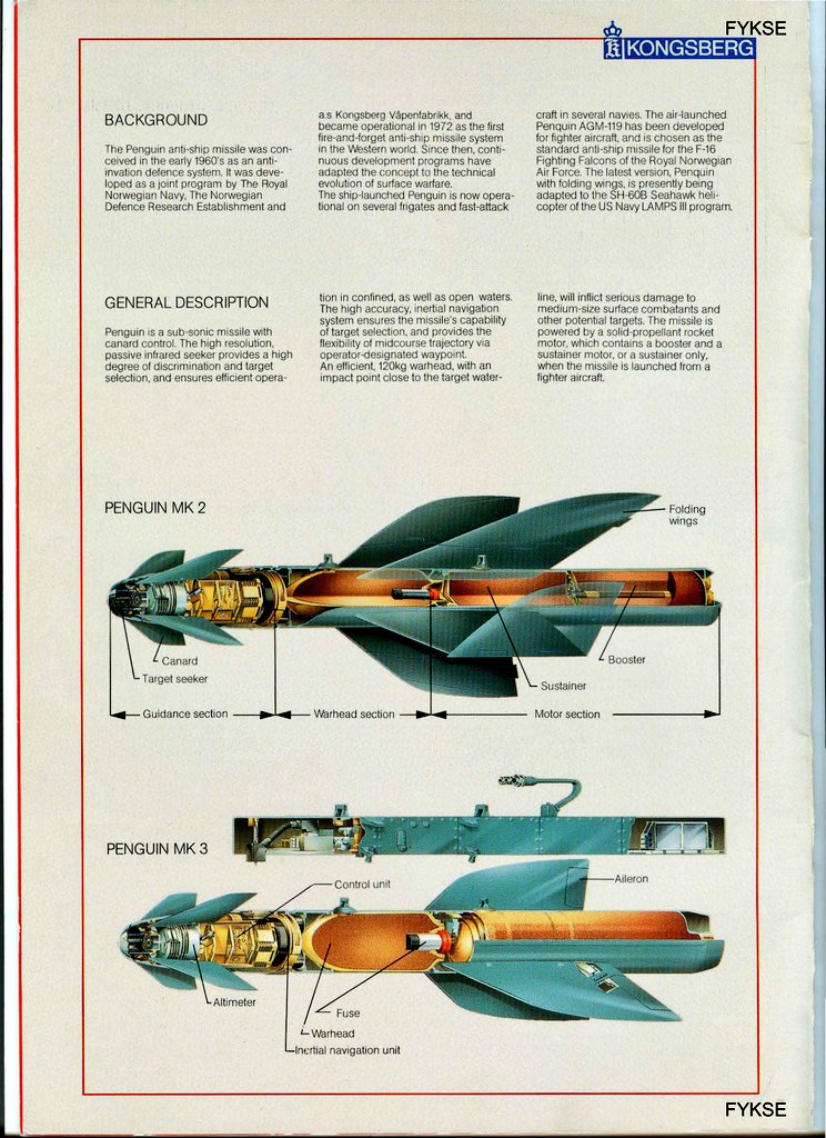 All’inizio degli anni ’70, la società norvegese Kongsberg Vapenfrabrikk (ora Kongsberg Defense & Aerospace), con il sostegno finanziario della US NAVY, sviluppò un missile anti-nave a corto raggio (SAR) denominato “Penguin”.