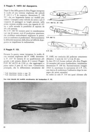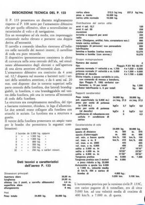 Il P.133, ex-P.108Bis fu richiesto nell’ottobre 1942 con ala aumentata ad 135 a 160 m2 e motori P.XII RC.35 da 1.500 hp. Ne vennero ordinati 24, poi ridotti nel maggio del ’43 a 6. Esso era stato ispirato più che dal B-17, dal B-24, un esemplare del quale era stato visionato da Casiraghi durante il conflitto. Il prototipo del P.133 MM.26248, con doppia deriva, motori potenziati, 6 cannoni da 20 e 4 da 12,7, 4,8 t di carico, velocità prevista 490 kmh, era in costruzione ai tempi dell’armistizio; poi se ne persero le tracce; forse rimase sepolto sotto una galleria usata per la sua costruzione al riparo di eventuali attacchi aerei distruttivi.
