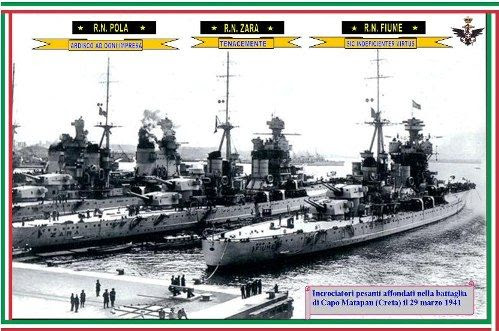 Dopo un’infruttuosa ricerca di convogli nemici e uno scontro senza esito con una formazione di incrociatori britannici a sud dell’isolotto di Gaudo, nel pomeriggio del 28 marzo la flotta italiana fu attaccata da aerosiluranti che danneggiarono la nave da battaglia Vittorio Veneto. Le altre unità si radunarono intorno all’unità colpita per difenderla da altri attacchi aerei, e fu nel corso di uno di essi che, alle 19:50 circa, un aerosilurante Fairey Swordfish britannico decollato da Creta colpì il Pola con un siluro, mettendo fuori uso tanto apparato motore quanto l’impianto elettrico e lasciandolo immobilizzato in mezzo al mare; la nave, praticamente alla deriva, imbarcava acqua e, priva di energia elettrica, non poteva muovere le torri dei cannoni. Con una controversa decisione, l’ammiraglio Iachino ordinò a Cattaneo di invertire la rotta e di inviare a soccorso del Pola l’intera 1ª Divisione unitamente ai cacciatorpediniere della IX Squadriglia (Vittorio Alfieri, Giosuè Carducci, Alfredo Oriani e Vincenzo Gioberti); la manovra di soccorso portò le unità italiane a breve distanza dalle flotta britannica dell’ammiraglio Andrew Cunningham che, cogliendole di sorpresa grazie all’oscurità, aprirono il fuoco affondando i due incrociatori Zara e Fiume e i cacciatorpediniere Alfieri e Carducci.