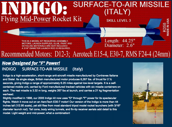 L’Indigo era un missile antiaereo utilizzabile per la bassa e bassissima quota, messo a punto nel 1972. Veniva lanciato da lanciatori trinati semoventi ed era progettato per l’uso con un’ampia gamma di sistemi di controllo del fuoco all’epoca esistenti della categoria del Superfledermaus di Contraves (nella versione trainata) o tramite radar di acquisizione e tracciamento Thomson-CSF Mirador Eldorado accoppiati con una centrale di tiro Galileo (quando si utilizzava il lanciatore semovente).