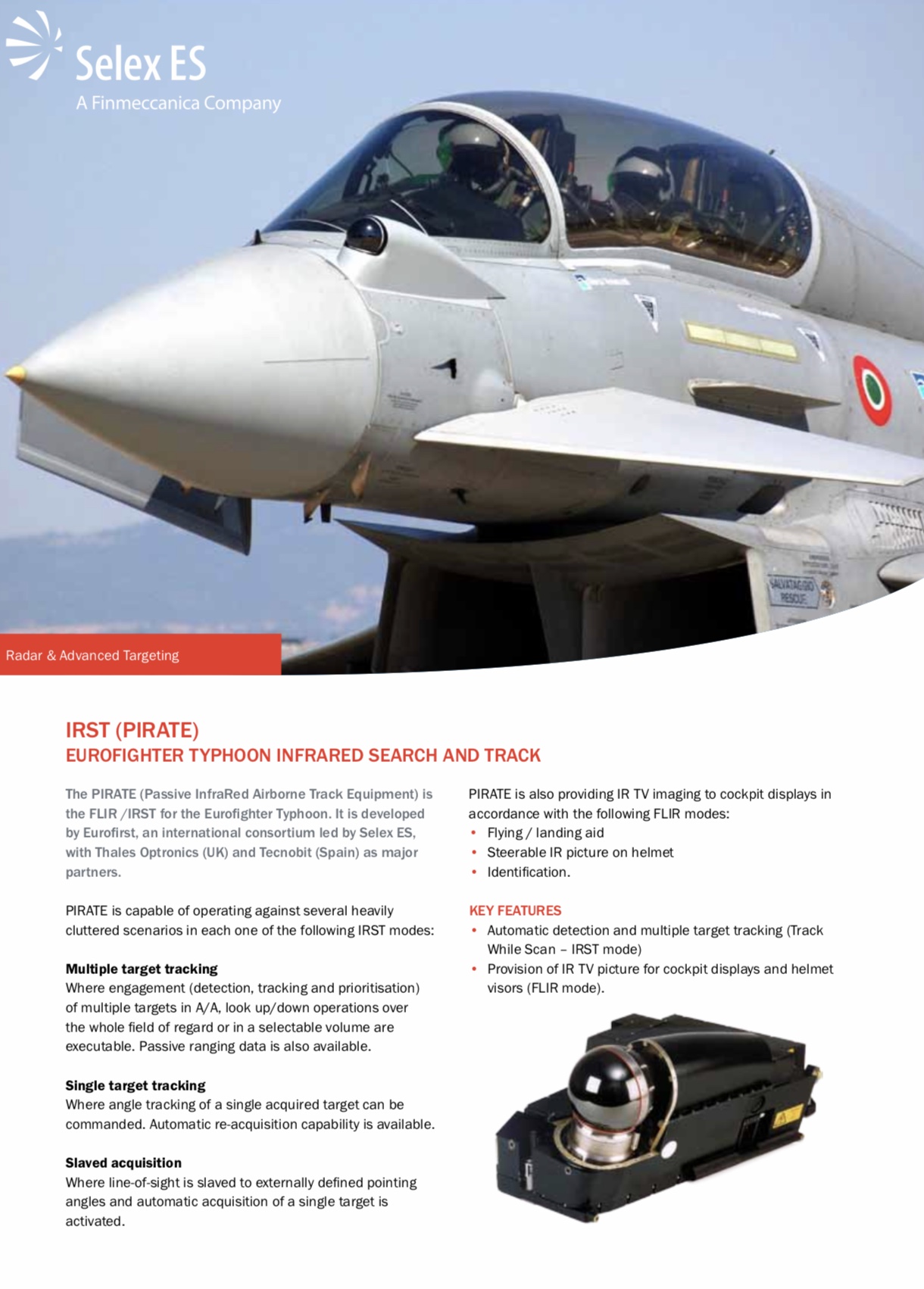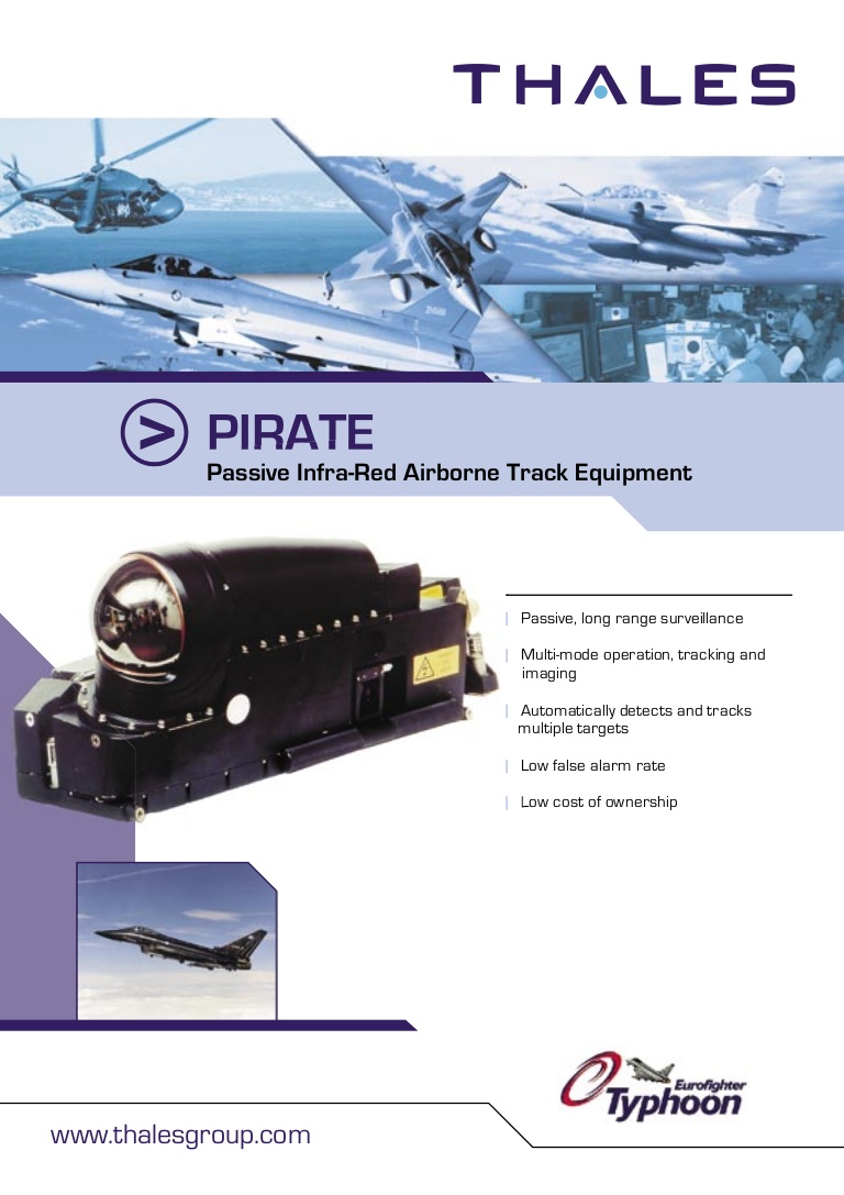 L’EuroFirst Passive Infrared Airborne Track Equipment PIRATE utilizza la ricerca e traccia in avanti a infrarossi (FLIR) / infrarossi (IRST) per l’Eurofighter Typhoon. È prodotto dal consorzio EuroFIRST composto da Leonardo SpA in Italia (appaltatore principale e autorità di progettazione e tecnica), THALES Land & Joint Systems del Regno Unito e TECNOBIT in Spagna. Il sistema è montato sul lato sinistro della fusoliera, davanti al parabrezza e fornisce mezzi passivi e quindi non rilevabili e non bloccabili di sorveglianza a lungo raggio. Inoltre, è stato dimostrato che il sistema individua velivoli stealth a una “distanza significativa” con ulteriori miglioramenti nel rilevamento tramite aggiornamenti software. Il PIRATE rileva il calore causato dall’attrito dell’aria sulla superficie esterna di un aeromobile.