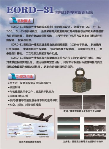 Il caccia Chengdu J-20 e lo Shenyang FC-31 condividono il concetto di design simile con il loro sistema EORD-31 che fornisce una copertura IRST a 360 gradi. I sistemi IRST possono essere utilizzati anche per rilevare velivoli invisibili, che in alcuni casi superano i radar tradizionali.