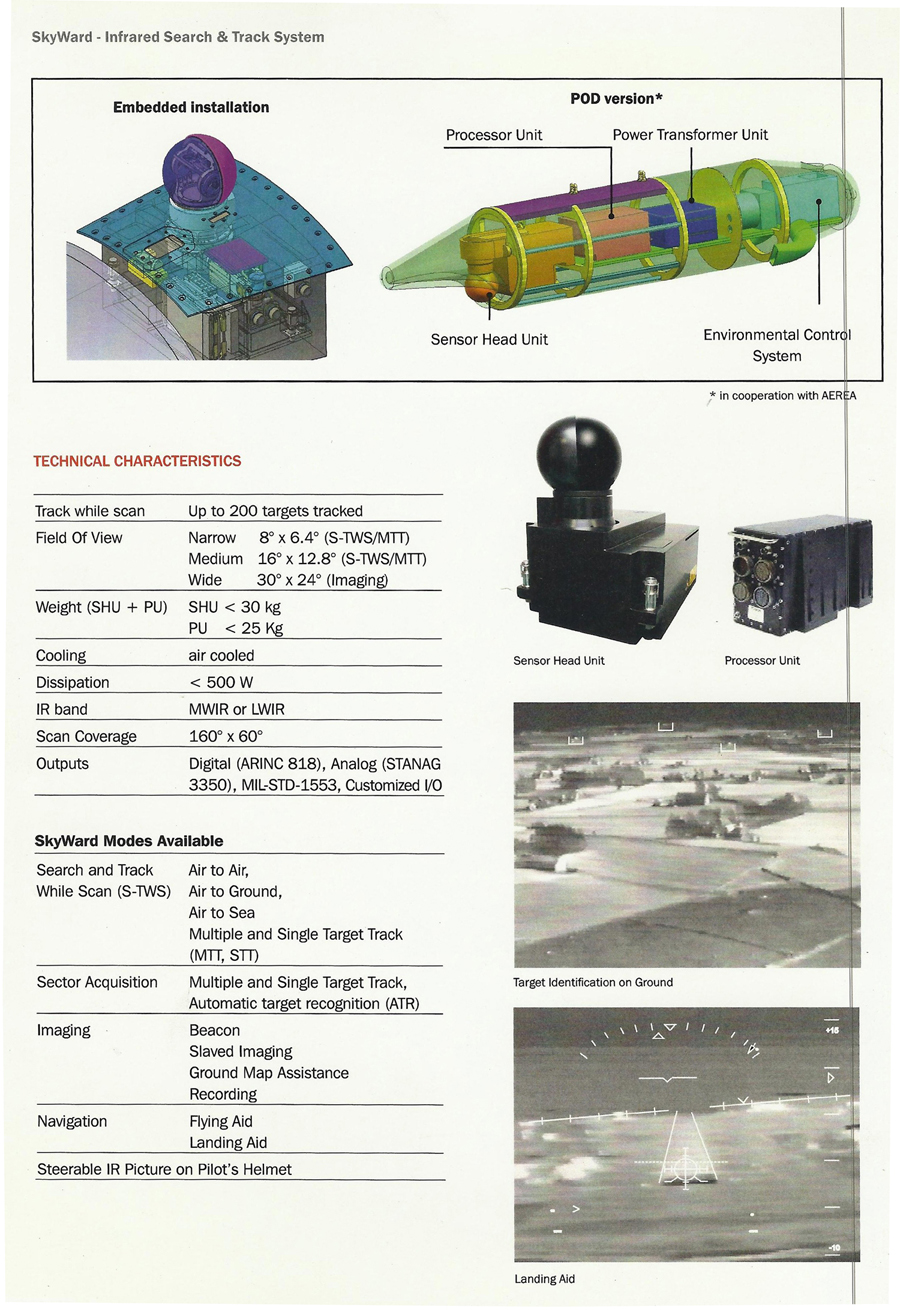 Il sistema SkyWard offre funzionalità all’avanguardia nella ricerca e tracciamento a infrarossi (IRST). Lo SkyWard si basa sulla vasta esperienza italiana nel campo degli IRST per i sistemi aerotrasportati e navali. Lo SkyWard è stato progettato e sviluppato da Leonardo per soddisfare i requisiti più esigenti degli aerei da caccia di quinta generazione con una soluzione incorporata. È inoltre disponibile una configurazione pod per consentire una facile installazione su piattaforme esistenti. Comprende due unità sostituibili in linea (LRU): un’unità testina sensore (SHU) e un’unità processore (PU).