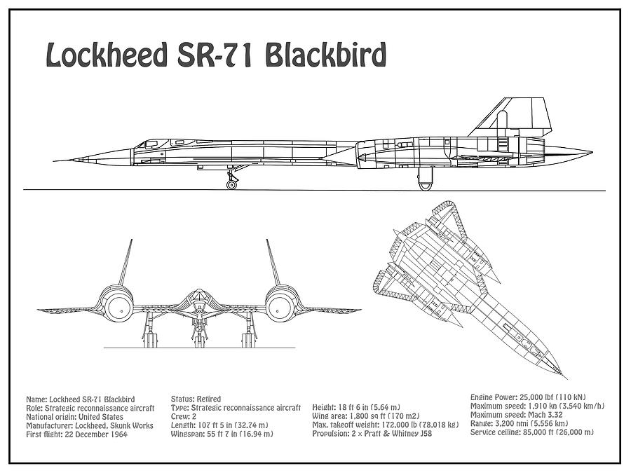 Il Lockheed SR-71, meglio conosciuto con il soprannome non ufficiale Blackbird, era un ricognitore strategico statunitense che prestò servizio dal 1966 fino al 22 novembre 1989, anno in cui tutti gli esemplari furono dismessi a causa della soppressione dei fondi per il loro utilizzo. Durante la sua carriera, l’SR-71 ha infranto alcuni record, come la maggior velocità mai raggiunta da un aereo con pilota (3530 km/h) e l’altezza massima (quasi 26000 m).