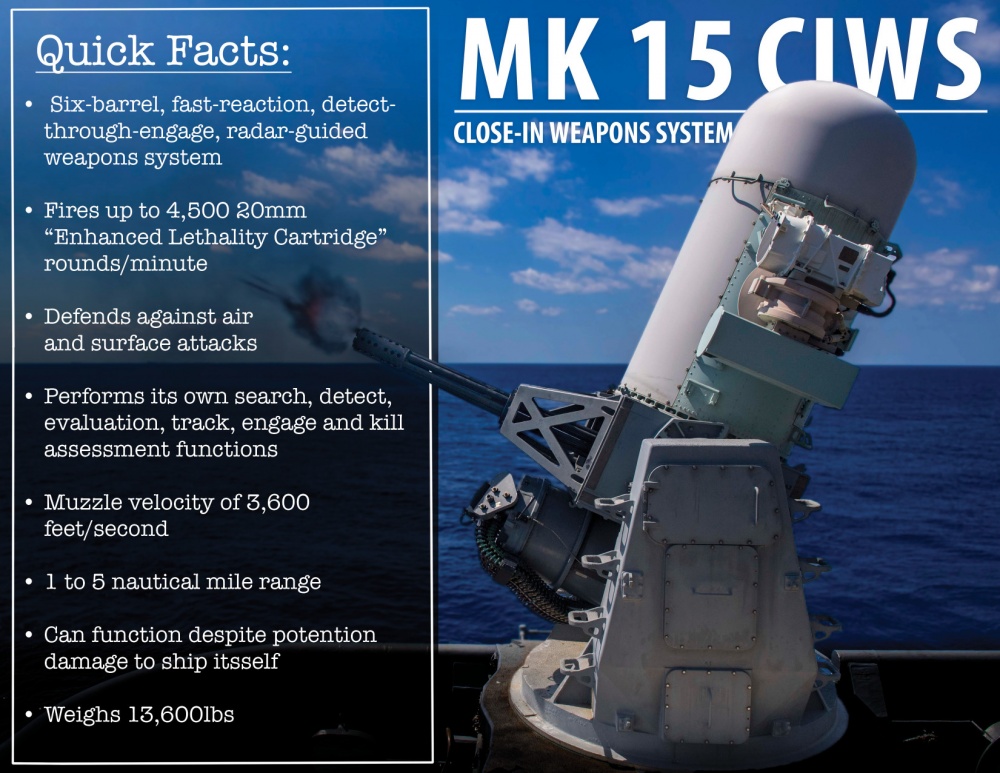 Il CIWS è progettato per essere l’ultima linea di difesa contro i missili anti-nave. A causa dei suoi criteri di progettazione, la sua portata effettiva è molto ridotta rispetto alla portata dei moderni ASM, da 1 a 5 miglia nautiche (da 2 a 9 km). Il supporto del cannone si muove a una velocità molto elevata e con grande precisione. Il sistema richiede input minimi dalla nave, rendendola in grado di funzionare nonostante i potenziali danni alla nave. Gli unici ingressi necessari per il funzionamento sono alimentazione elettrica trifase 440 V AC a 60 Hz e acqua (per il raffreddamento dell’elettronica). Per il pieno funzionamento, comprese alcune funzioni non essenziali, dispone anche di ingressi per la vera prua della bussola dell’imbarcazione e 115 V CA per il sottosistema PASS.