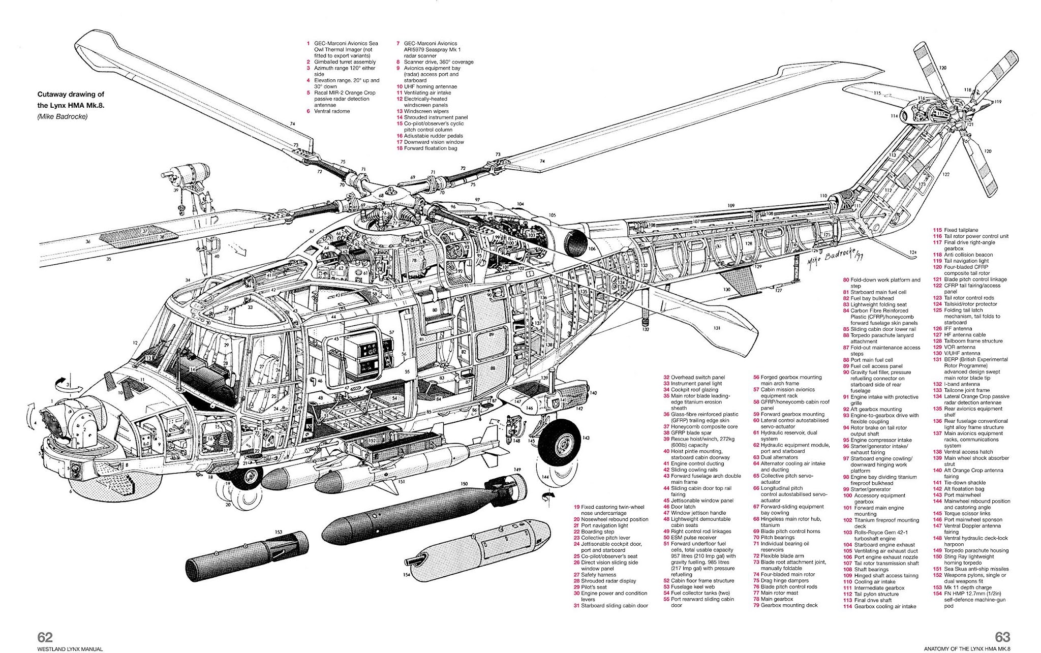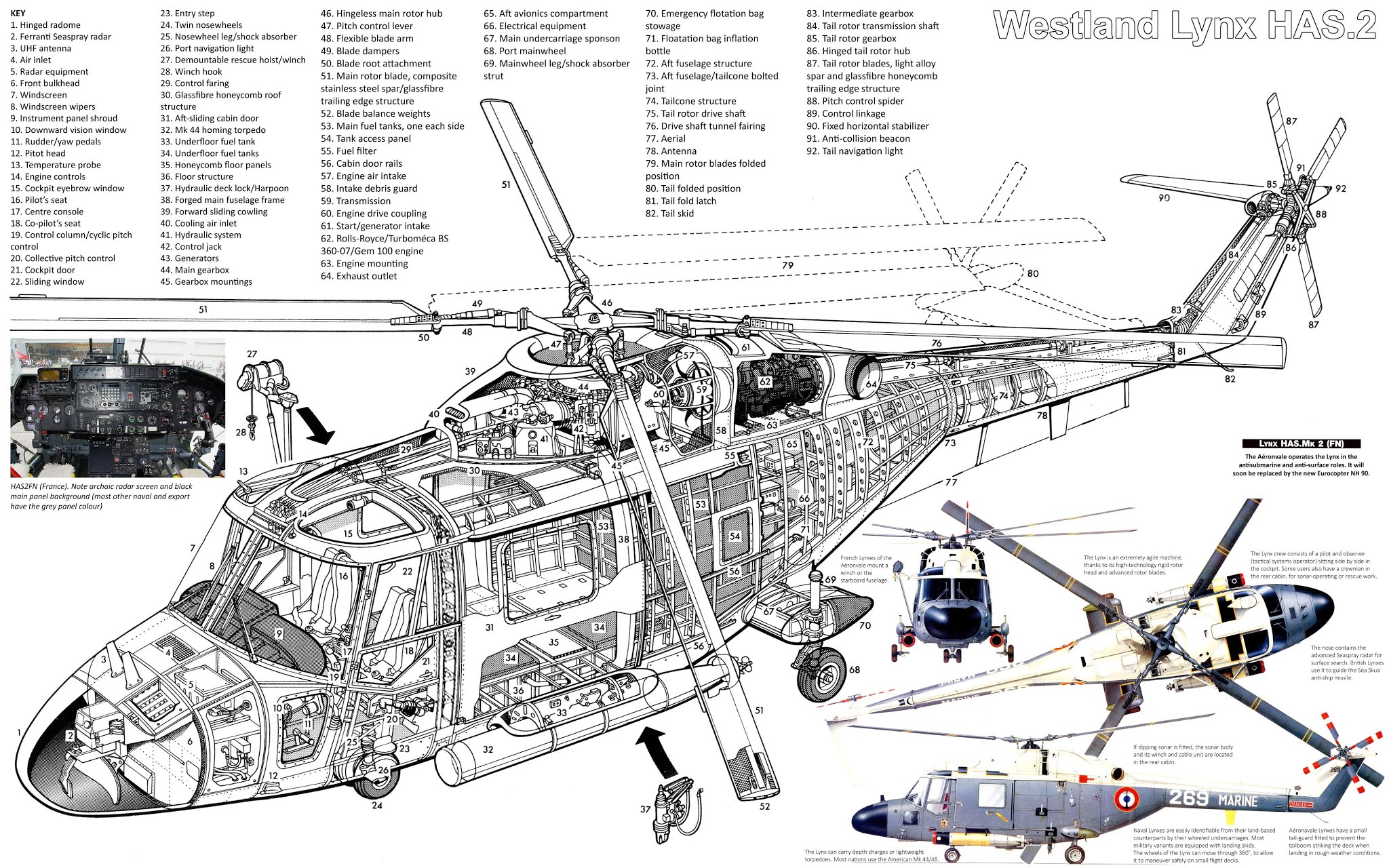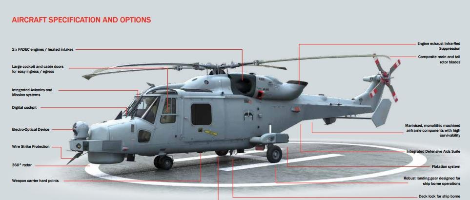 Un sensore SEA OWL garantisce portate di scoperta infrarosse di 48 km teoriche, vi è un pod da ricognizione Vinten VIPA 1, un sistema ESM, mappa digitale, sistema DAS di autodifesa elettronica con sensori di rilevamento e disturbo missili e un computer capace di memorizzare e visualizzare fino a 500 bersagli contemporaneamente. La sua dotazione comprende anche un sistema AFCS di controllo del volo, pale composite per il rotore di nuova generazione ed una serie di sistemi, come il sonar filabile AQS-18, verricello di salvataggio da 272 kg e altre attrezzature, missili Sea Skua, siluri Stingray, mitragliatrici e altro ancora. Il suo ruolo principale è soprattutto quello di attacco antinave, per cui la ricerca antisommergibile è un aspetto relativamente secondario, come in genere accade per i Lynx.