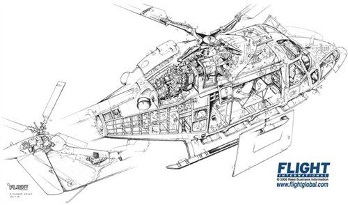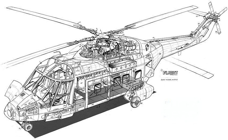 I motori e la trasmissione sono praticamente incassati nella parte posteriore della fusoliera. Si tratta di due Rolls-Royce Gem che erogano potenze dell’ordine dei 1000 hp, via via aumentate con le versioni dell’elicottero, passate dal peso massimo al decollo di 4300 kg a 6500. Gli scarichi sono dietro i motori, a filo della superficie esterna. I serbatoi sono due posizionati dietro il vano trasporto e due sotto il pavimento dello stesso. Nella parte finale della fusoliera vi sono alcune apparecchiature dell’avionica di bordo e i principali sistemi elettrici.