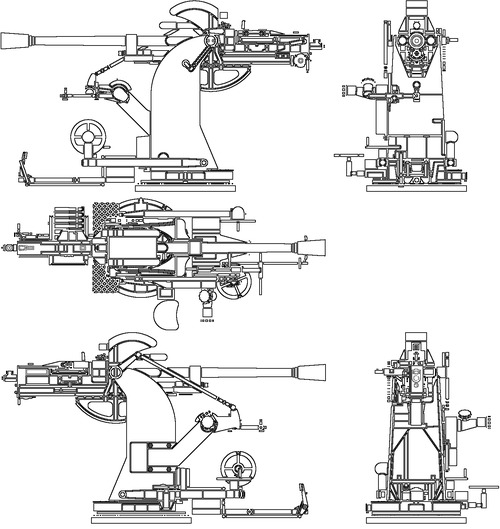 Mod. 1938: molto simile al Mod. 1932, questo impianto binato navale era privo di sistema di stabilizzazione ed era raffreddato ad aria. Queste modifiche riducevano il peso a 4.300 kg.