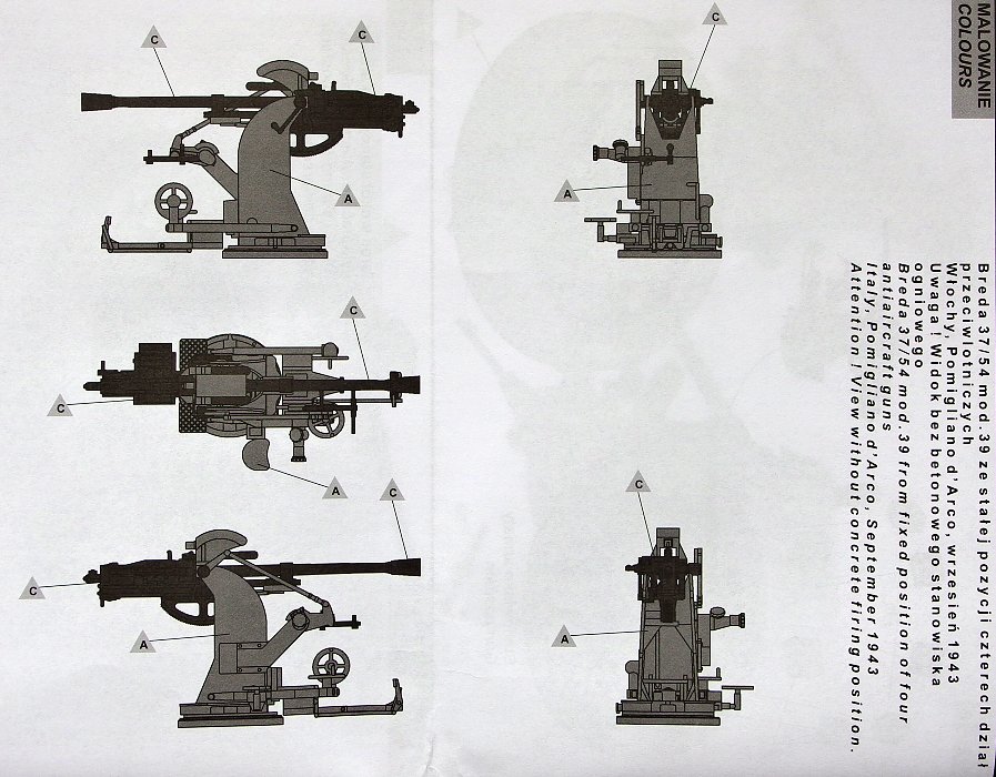 Mod. 1939: era un impianto singolo con affusto a piedistallo a brandeggio totale, con freno di sparo, raffreddato ad aria, pesante 1.419 kg. Venne realizzato in tre versioni: due navali ed una terrestre. La versioni navali erano rispettivamente a due puntatori e con puntatore singolo, posizionato su un seggiolino davanti all’affusto, sotto alla canna. Quest’ultima versione poteva essere montata su installazione a scomparsa, con l’impianto che, con la canna alla massima elevazione, veniva calato in un boccaporto corazzato. La versione terrestre, in dotazione alla MDICAT, erano leggermente modificati, con alcune migliorie al sistema di puntamento e venivano impiegati in installazione fissa, eventualmente asservita ad una Centrale di tiro Mod. 1940 “Gamma”.