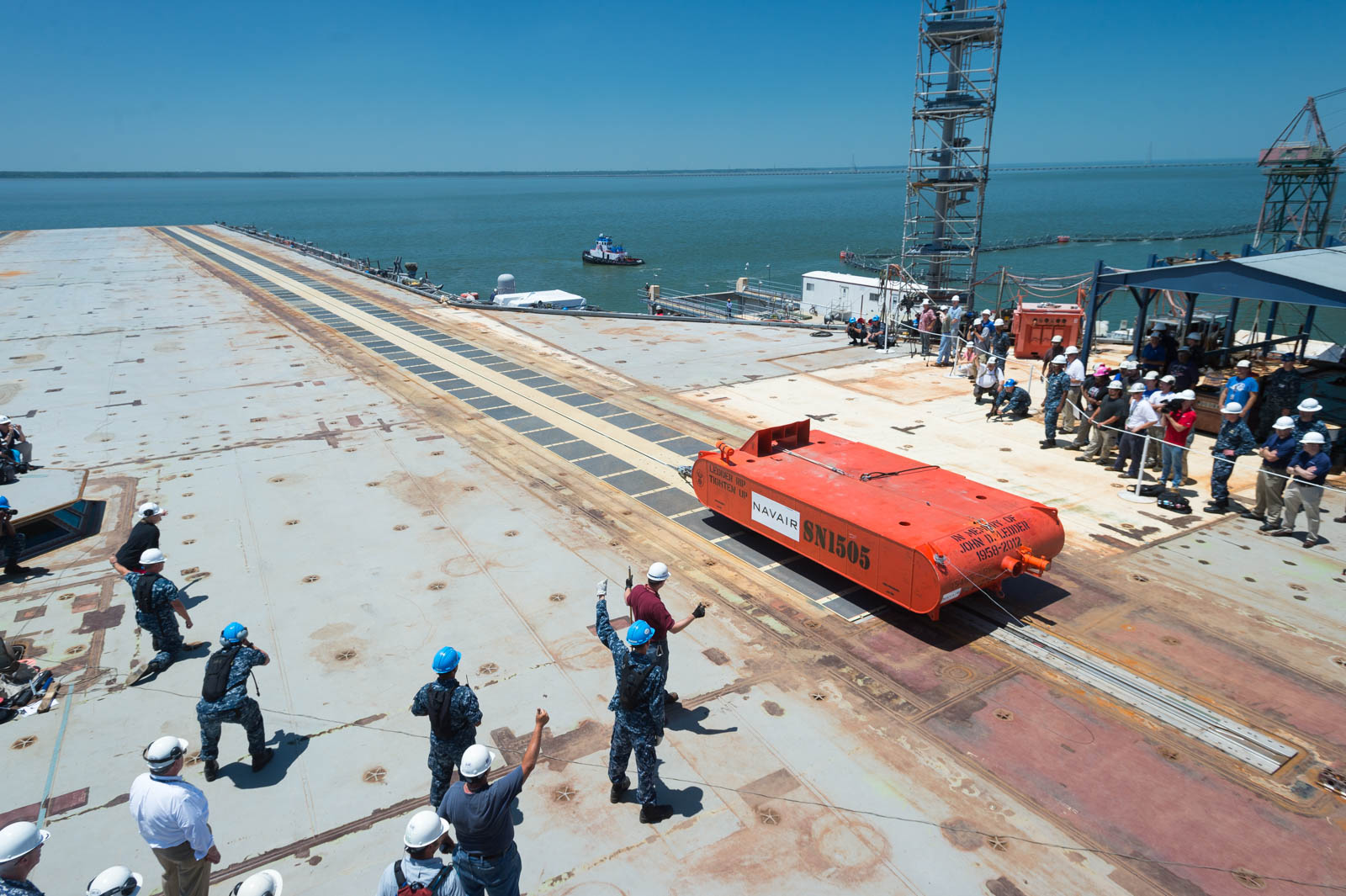 Giugno 2014: la Marina ha completato i test sui prototipi EMALS di 450 lanci di aerei con equipaggio che coinvolgevano tutti i tipi di aeromobili portati da portaerei ad ala fissa nell’inventario USN presso la Joint Base McGuire-Dix-Lakehurst durante due campagne Aircraft Compatibility Testing (ACT).