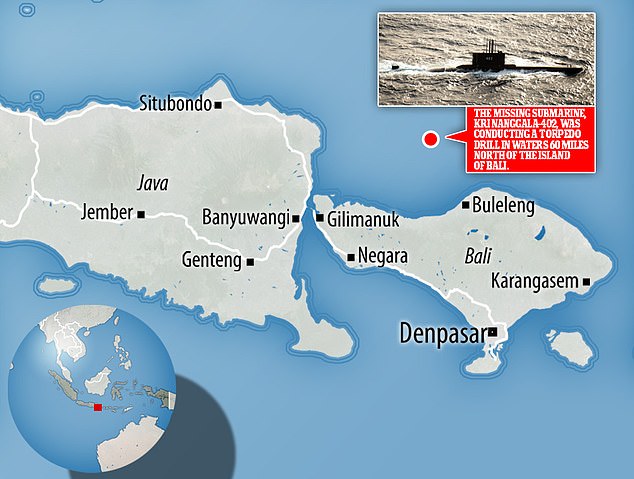Come già evidenziato in precedenza, in data 21 aprile 2021, il portavoce della Marina indonesiana, il primo ammiraglio Julius Widjojono, ha annunciato che il Nanggala non si era presentato per un briefing a seguito di un’esercitazione di siluri nel mare di Bali al largo della costa di Surabaya, a circa 95 km (51 miglia nautiche) a nord di Bali, in un’area in cui il mare è profondo circa 700 metri. Al momento della scomparsa, il Nanggala aveva un equipaggio di 53 uomini.