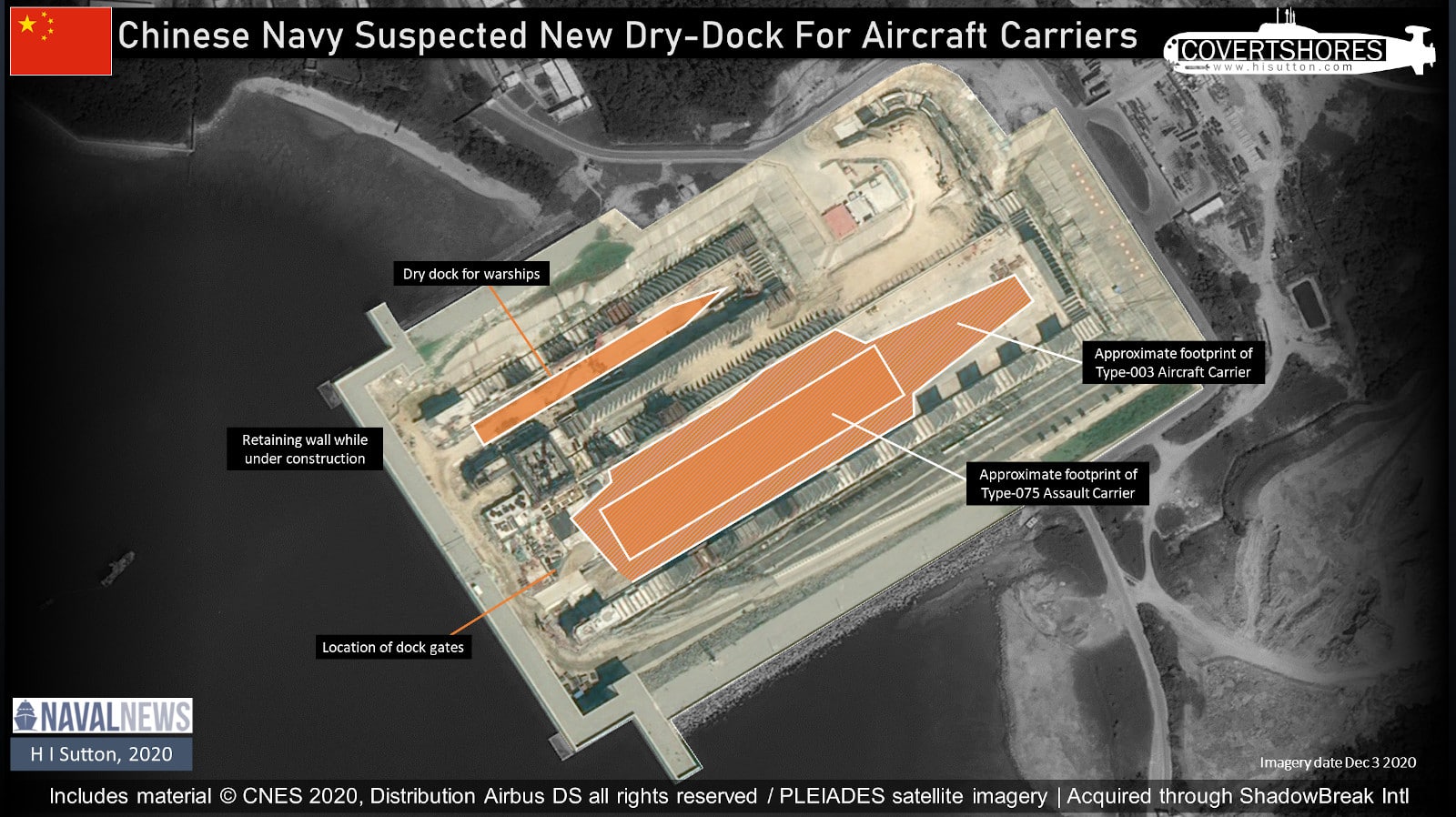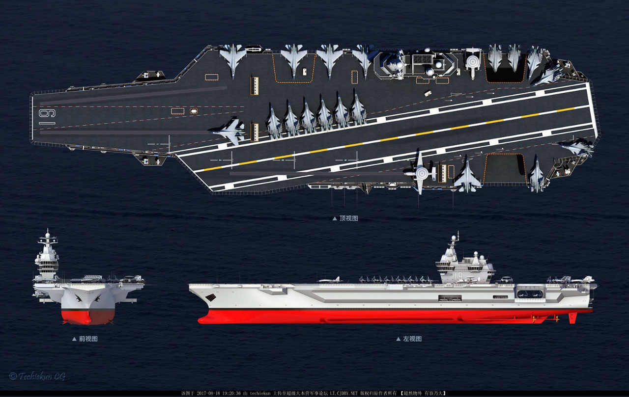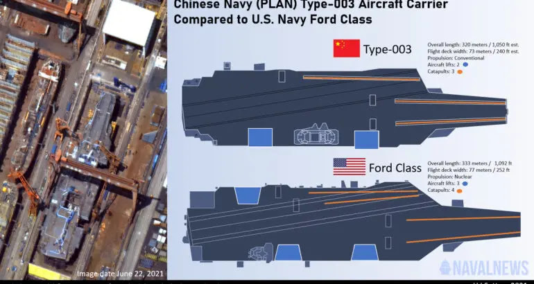 Le ultime immagini satellitari commerciali di Kompsat, tramite Shadowbreak Inti., consentono di misurare finalmente le dimensioni e il layout della Type-003, consentendo un confronto generale di alto livello con la Classe Ford.