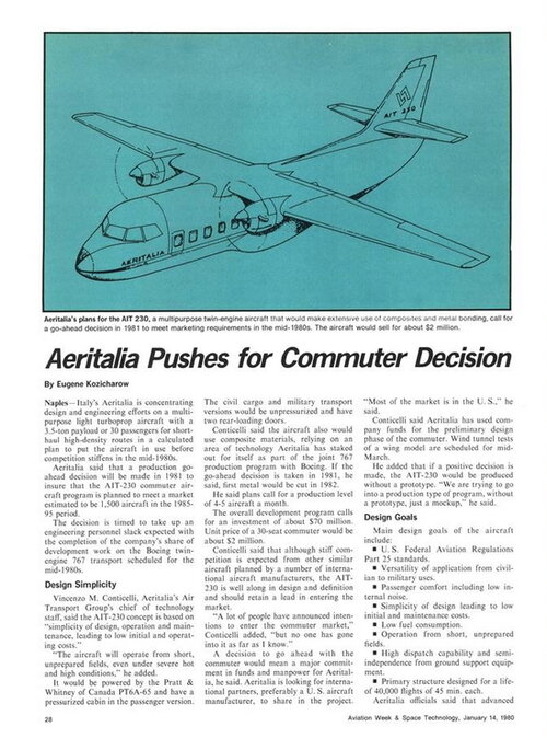 La società Aeritalia all’epoca voleva collaborare con un produttore statunitense per garantire la sua introduzione sul mercato statunitense. Fu inoltre studiata una versione allungata da 50-60 passeggeri, pronta per essere lavviata dopo la versione da 30 posti.