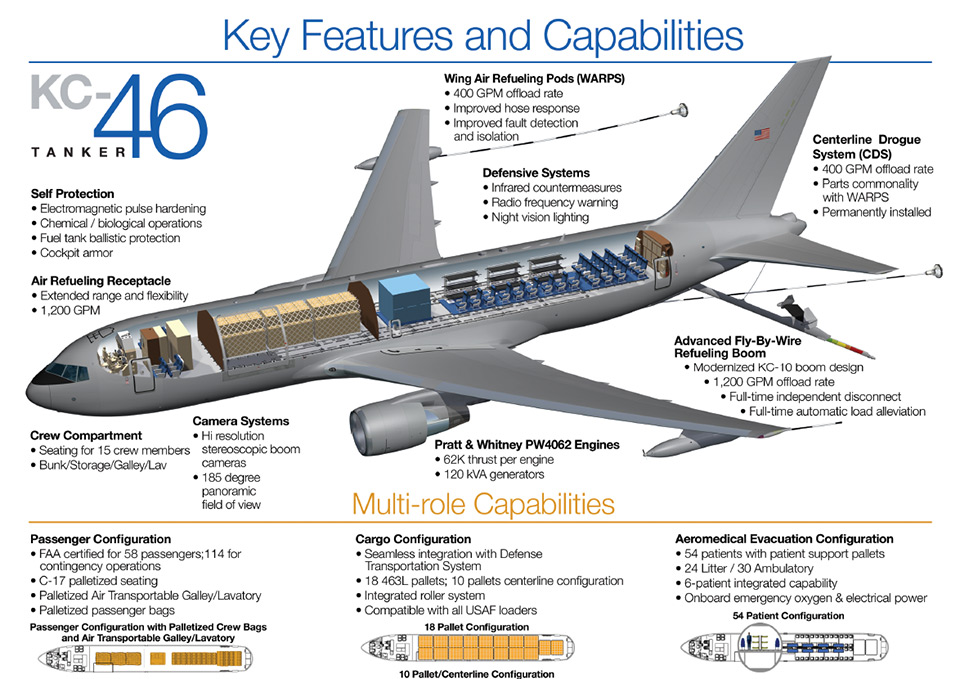 Il 24 febbraio 2011, l’USAF annunciò la selezione dell’offerta di aerocisterna KC-767 della Boeing. L’aereo fu designato KC-46A. La Boeing ottenne anche un contratto di sviluppo per l’aerocisterna che prevede che Boeing completi e consegni 18 KC-46 operativi iniziali entro il 2017. L’Air Force sta cercando di ricevere un totale di 179 velivoli. Il “NewGen Tanker” della Boeing è basato sul 767-200 con una versione migliorata del boom di rifornimento del KC-10 e display della cabina di pilotaggio del 787.