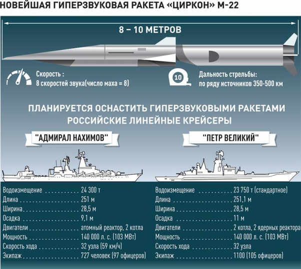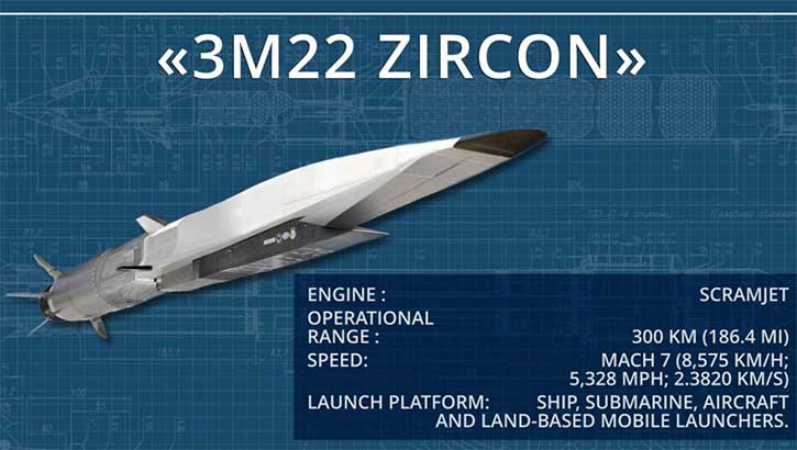 Lo Zircon (in cirillico: Циркон, nome in codice NATO: SS-N-33), noto anche come 3M-22 Zircon o 3M-22 Tsirkon, è un missile cruise ipersonico di fabbricazione russa, in fase di test, progettato per neutralizzare unità navali maggiori tra cui portaerei, incrociatori e cacciatorpediniere. Ritenuto in grado di intercettare obiettivi sia marini che terrestri ad una distanza non inferiore ai 1.000 km, può viaggiare a velocità vicine a Mach 9 e ad altitudini comprese fra i 30 ed i 40 km dove l’aria è più rarefatta e l’attrito inferiore.