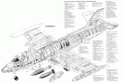 La maggior parte dei sistemi alimentati, come i comandi di volo, sfruttava principalmente la potenza idraulica sotto forma di un sistema ad alta pressione Dowty azionato dal motore a turbogetto dell’aereo e integrato da accumulatori per il funzionamento di emergenza del carrello, freni ad aria e flap. Un secondo sistema di backup era fornito tramite un sistema pneumatico, che alimentava i freni delle ruote nonché lo spiegamento del carrello d’atterraggio e l’apertura del tettuccio. L’aria di spurgo prelevata dal motore forniva la pressurizzazione della cabina di guida e l’ aria condizionata per il comfort del pilota. L’impianto elettrico comprendeva un generatore a 24 V CC; l’elettricità veniva utilizzata per vari sistemi, tra cui l’avviamento del motore, le pompe del carburante, il riscaldamento del parabrezza, la radio ad altissima frequenza (UHF) e il sistema radar. Gli armamenti erano immagazzinati sotto le ali e all’interno di un vano per le armi nella sezione centrale della fusoliera; quest’ultimo poteva ospitare razzi, bombe a frammentazione o al napalm, o un grande serbatoio di carburante per una maggiore autonomia; inoltre, una coppia di cannoni da 30 mm erano montati permanentemente sul muso.
