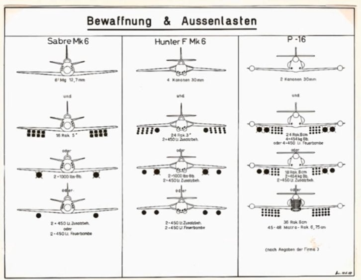 - P-16-Trainer : versione trainer con due posti in tandem per l’Aeronautica Militare Svizzera. Senza i due cannoni da 30 mm della versione monoposto;