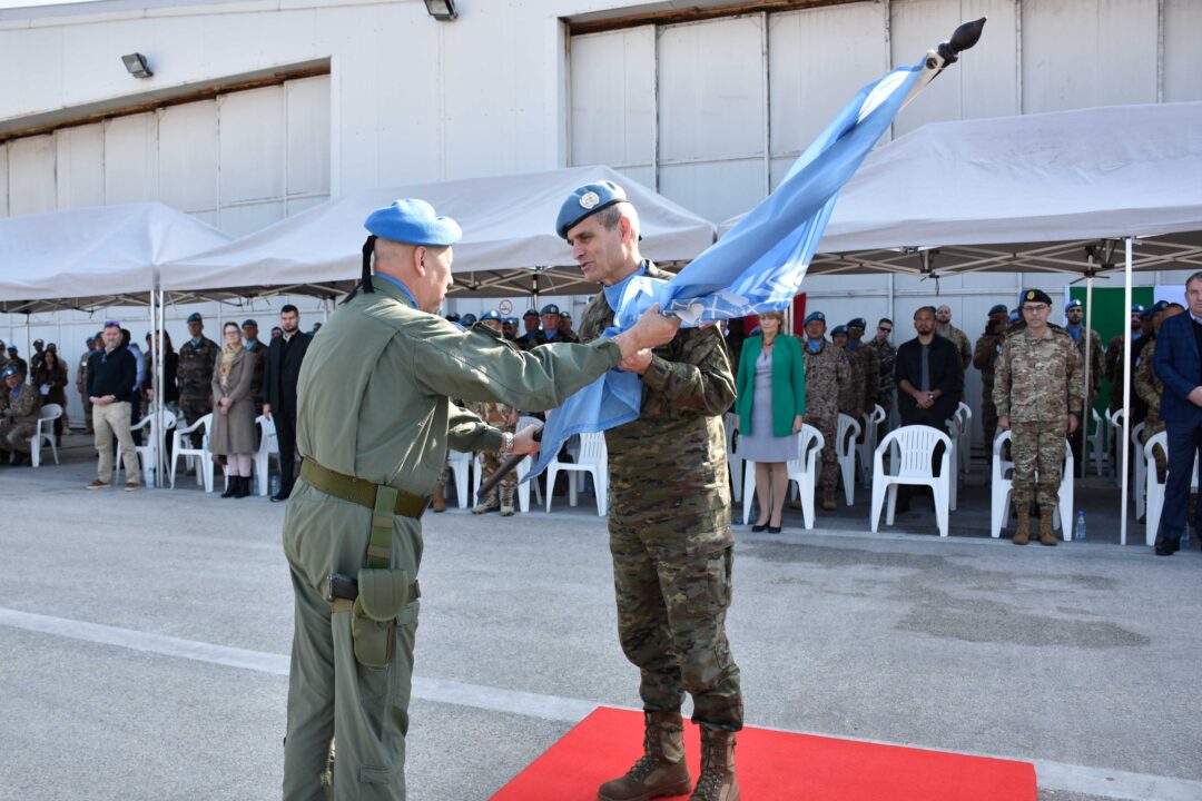 Il Colonnello Fabrizio Barone consegna la bandiera delle Nazioni Unite al Comandante di UNIFIL