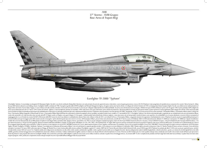 L’Eurofighter (nomenclatura aeronautica F-2000A) è un caccia di ultima generazione, il più avanzato aereo da combattimento mai sviluppato in Europa, in grado di offrire capacità operative di ampio respiro e un’efficacia impareggiabile nel settore della Difesa Aerea. L’inserimento di questi velivoli nel servizio d’allarme nazionale, garantito dai reparti dell’Aeronautica Militare per la Difesa Aerea 24 ore su 24, 365 giorni all’anno, permette di fornire una maggiore capacità a quel complesso dispositivo che, in pochi minuti, assicura il decollo dei caccia per intercettare e identificare qualunque traccia aerea sospetta rilevata dai radar. E’ il frutto della collaborazione industriale di Germania, Gran Bretagna, Italia e Spagna.