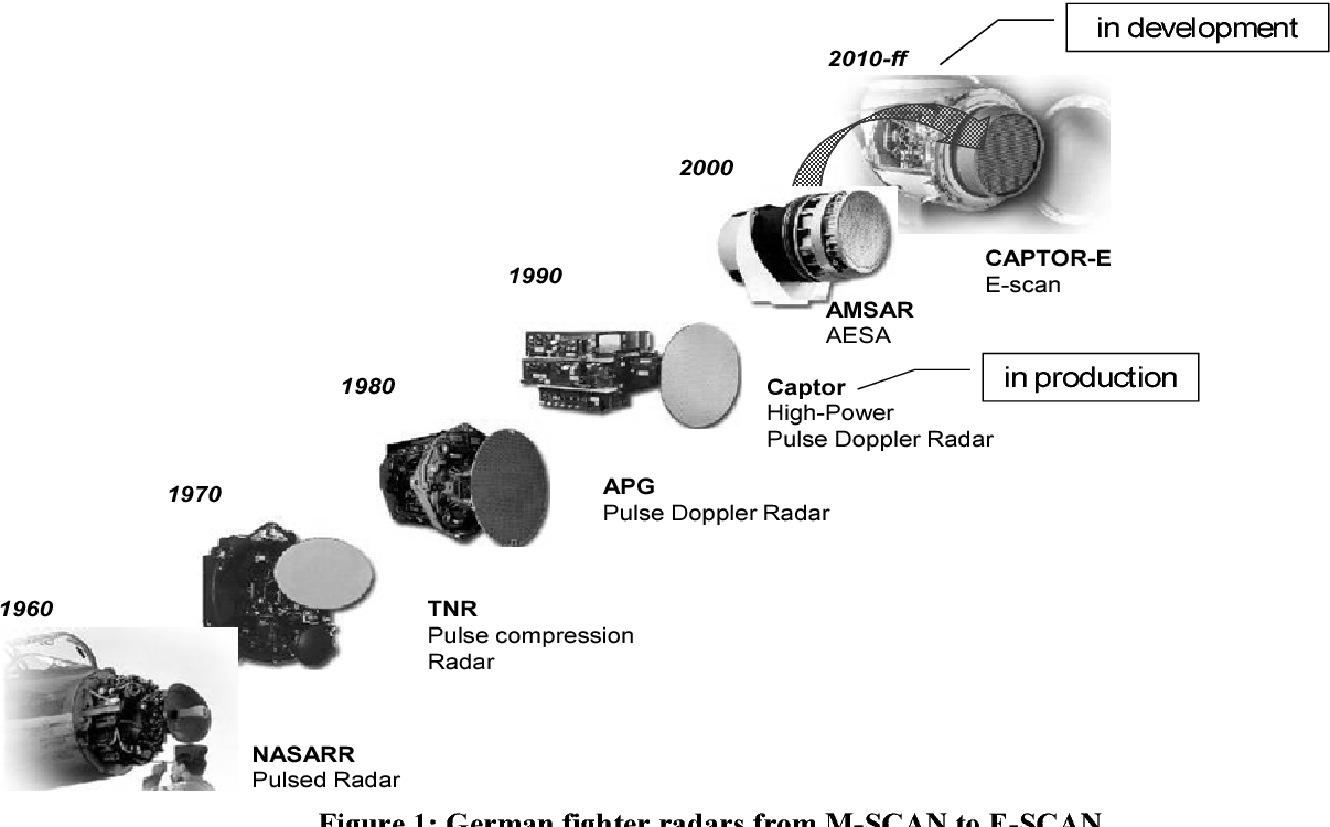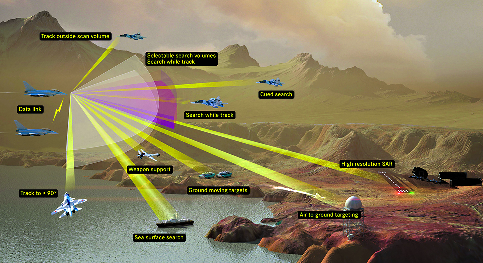 CAPTOR-E – Nel 1993 è stato avviato un progetto di ricerca europeo per creare l’AMSAR (Airborne Multirole Solid State Active Array Radar), condotto dal consorzio GTDAR (GEC-Thomson-DASA Airborne Radar), oggi composto da Selex ES, Thales e Airbus. Esso si è evoluto nel progetto CAESAR (CAPTOR Active Electronically Scanned Array Radar), adesso noto come CAPTOR-E Active electronically scanned array.